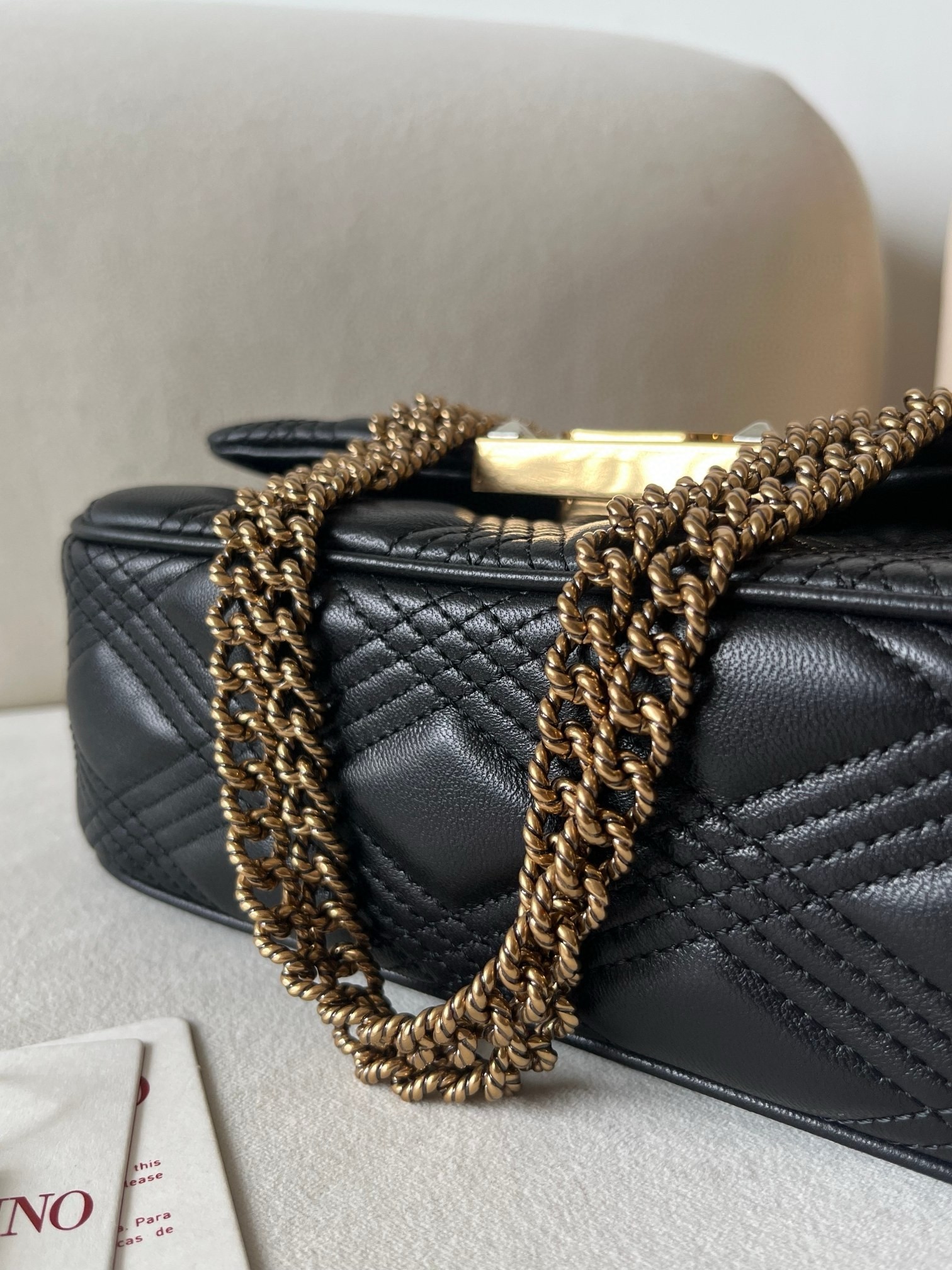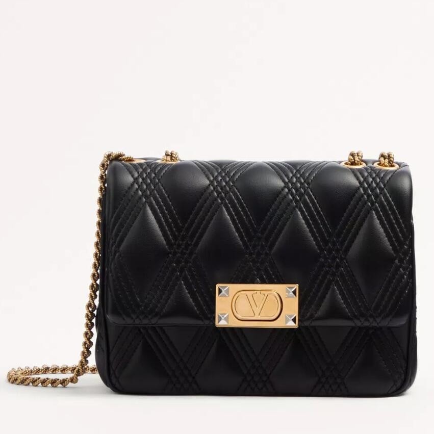As the name suggests, the Quiltie 67 bag from Valentino Garavani features a diamond-quilted leather exterior for visual and textural intrigue. Its spacious interior is a given, so we want to turn your attention to its clasp instead. It features the signature VLogo in gold-tone hardware surrounded by the ever-iconic Rockstuds in a contrasting finish.