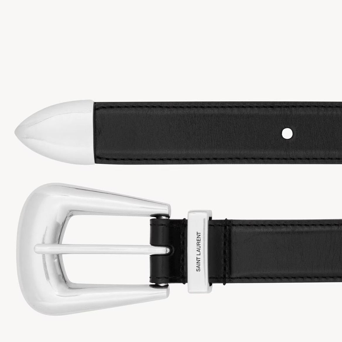 Saint Laurent's Folk belt is punctured with a silver-tone buckle and tip that lend a decidedly Western feel. It's been crafted from smooth leather and engraved with the house's moniker at the loop.