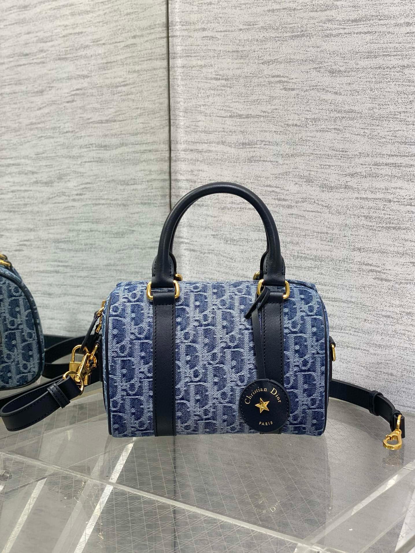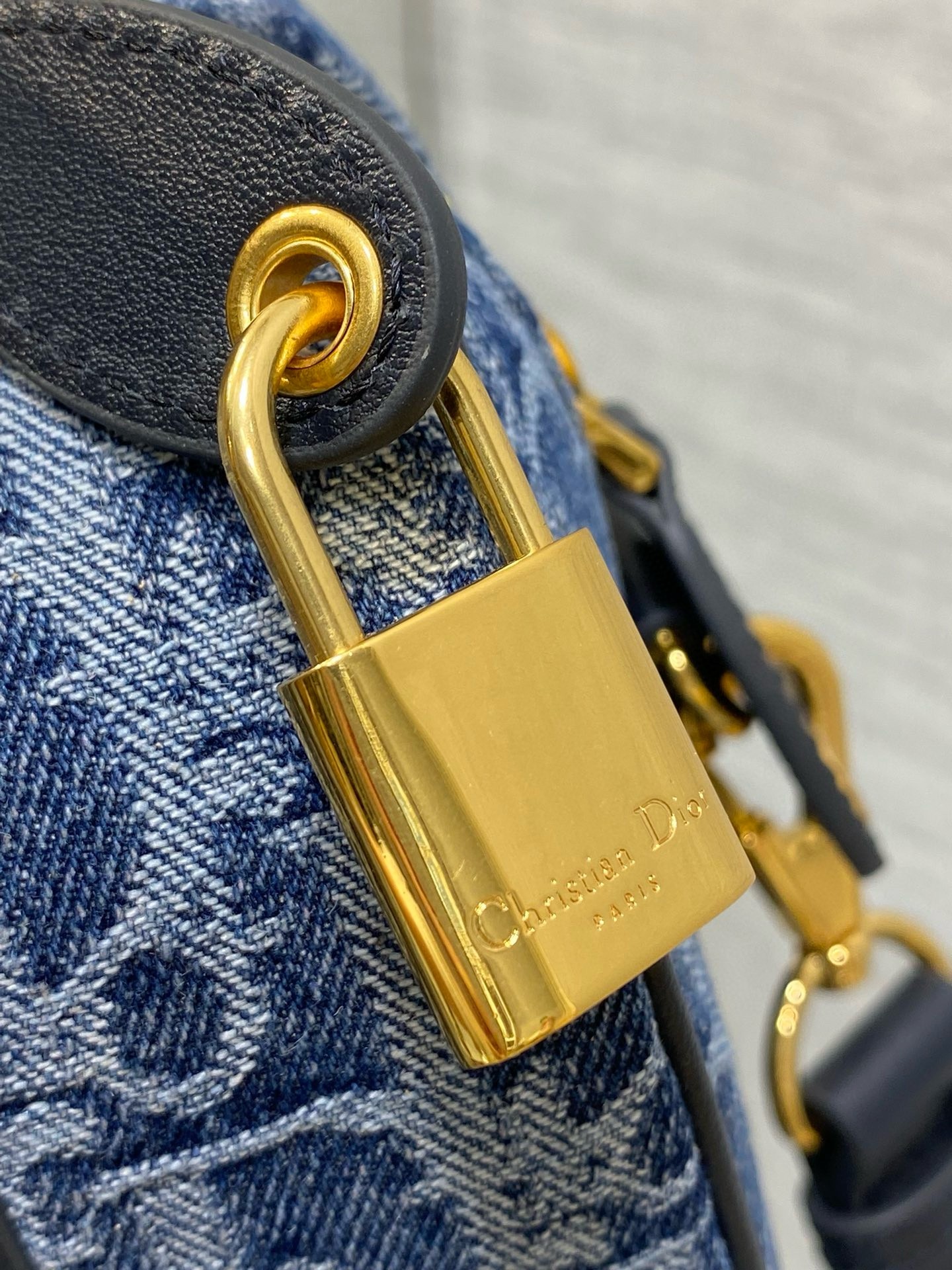 The Dior Groove 20 bag is an elegant and modern style designed by Maria Grazia Chiuri. Constructed in blue Denim Dior Oblique jacquard, offering a new take on the iconic House motif with the modern appeal of an irregular stonewashed effect, it stands out with a leather key holder engraved with the Christian Dior Paris signature and a gold-finish star. The attached key opens the zipper padlock to reveal a spacious compartment that can accommodate all the essentials, completed by a slip pocket and a zip pocket. Featuring leather top handles and an adjustable, removable strap, the bag can be carried by hand, worn over the shoulder or crossbody as an ideal daily companion.