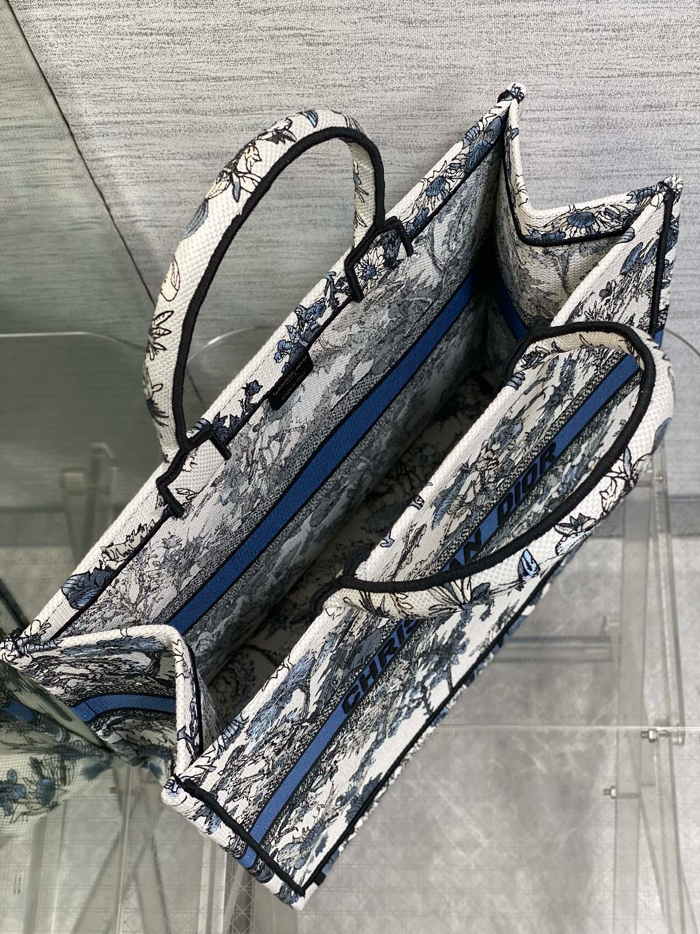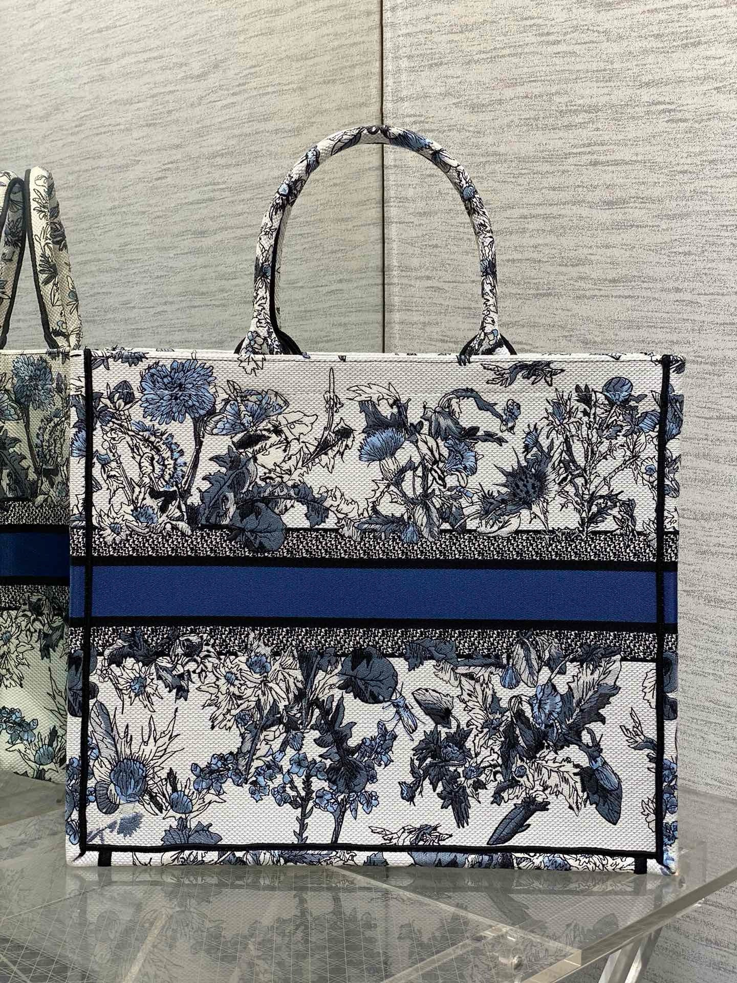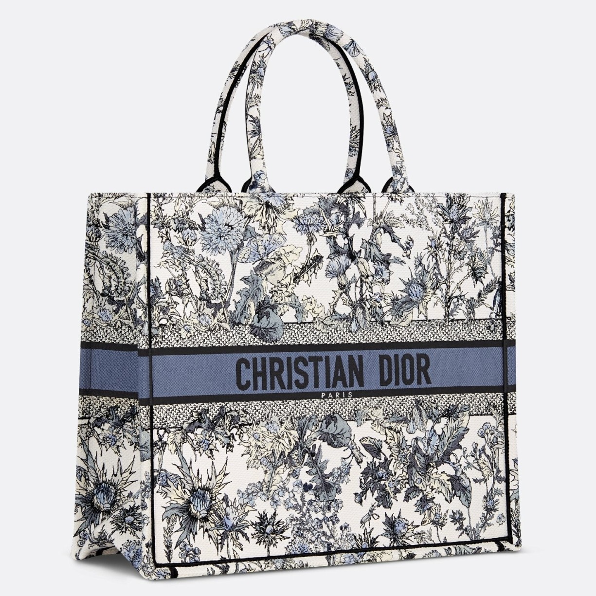 Introduced by Maria Grazia Chiuri, Creative Director of Christian Dior, the Dior Book Tote has become a staple of the Dior aesthetic. Created to hold all the daily essentials, the medium style is fully embroidered with the denim blue Dior Chardons motif by Pietro Ruffo, showcasing the national flower of Scotland, which symbolizes protection, resilience and freedom. Adorned with the Christian Dior Paris signature on the front, the large tote exemplifies the House's savoir-faire and can be carried by hand or worn over the shoulder. The bag can be coordinated with the season's other Dior Chardons creations.