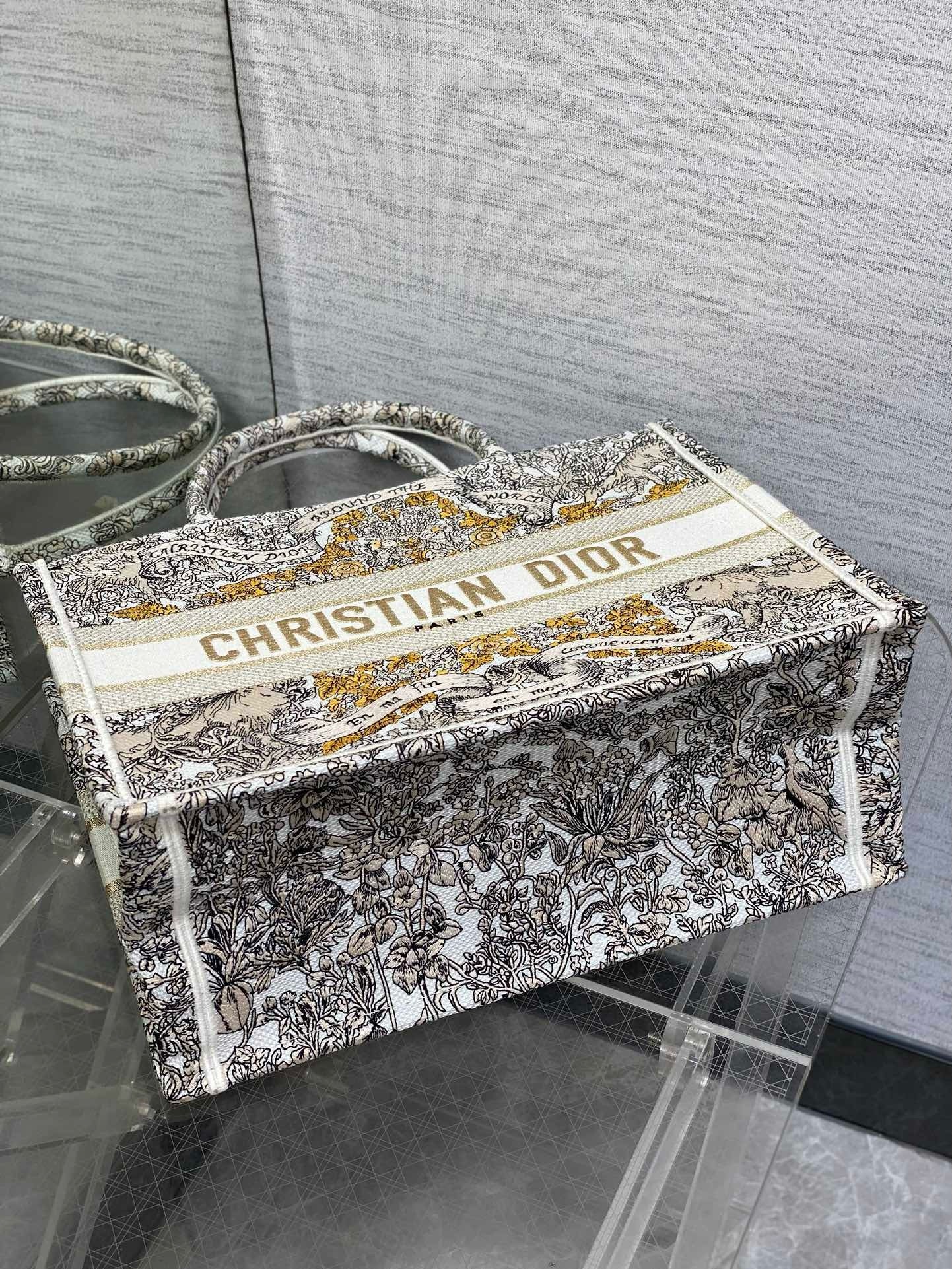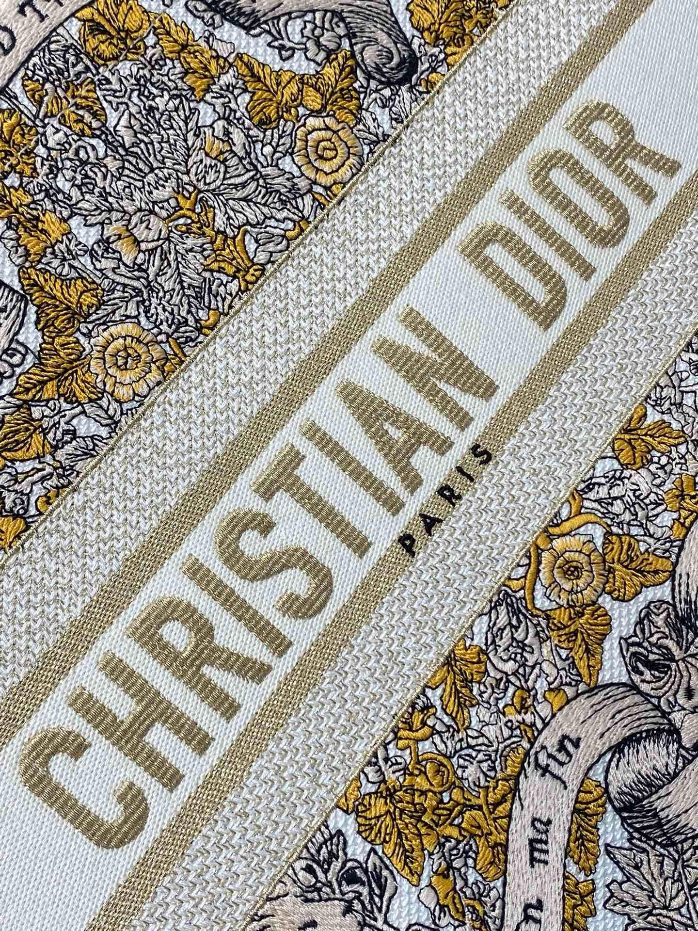 Introduced by Maria Grazia Chiuri, Creative Director of Christian Dior, the Dior Book Tote has become a staple of the Dior aesthetic. Designed to hold all the daily essentials, the medium style is fully embroidered with Pietro Ruffo's Dior Around the World motif, showcasing a star decorated with flowers in honor of Scottish heritage, the collection's hallmark theme, and an allegory of the senses with a Mary Stuart quote: 'En ma fin est mon commencement' (In my end is my beginning). Adorned with the Christian Dior Paris signature on the front, the medium tote is a prime example of Dior's savoir-faire and can be carried by hand or worn over the shoulder. The bag can be coordinated with the season's other Dior Around the World creations.