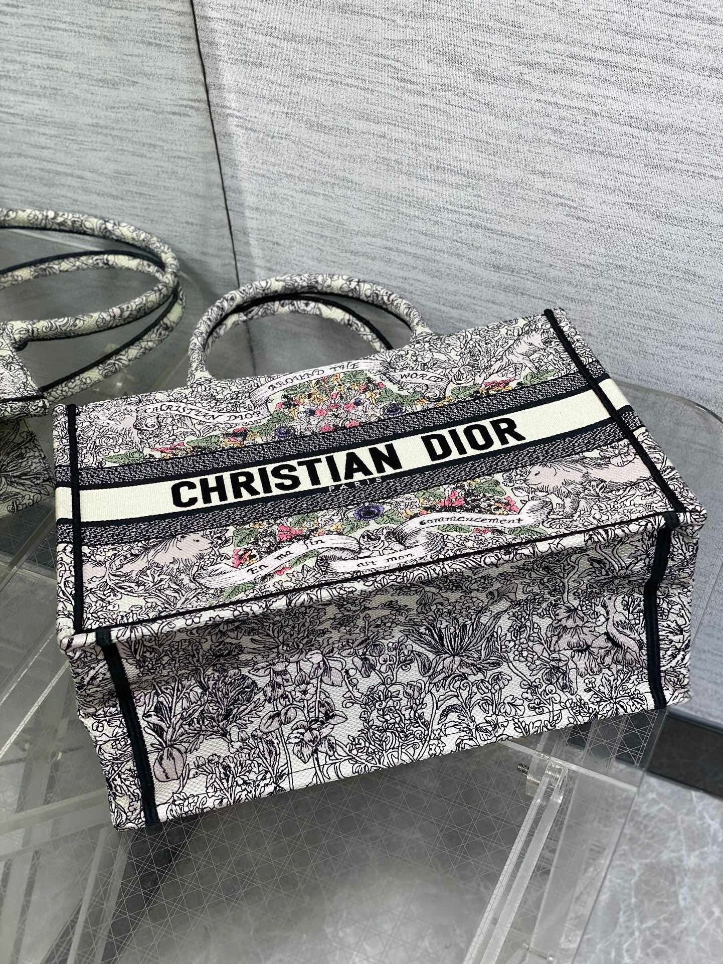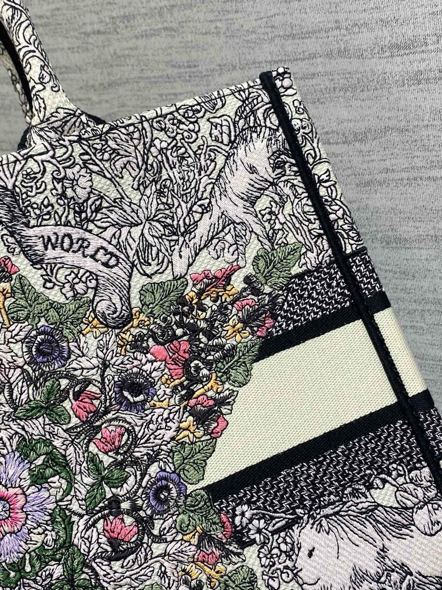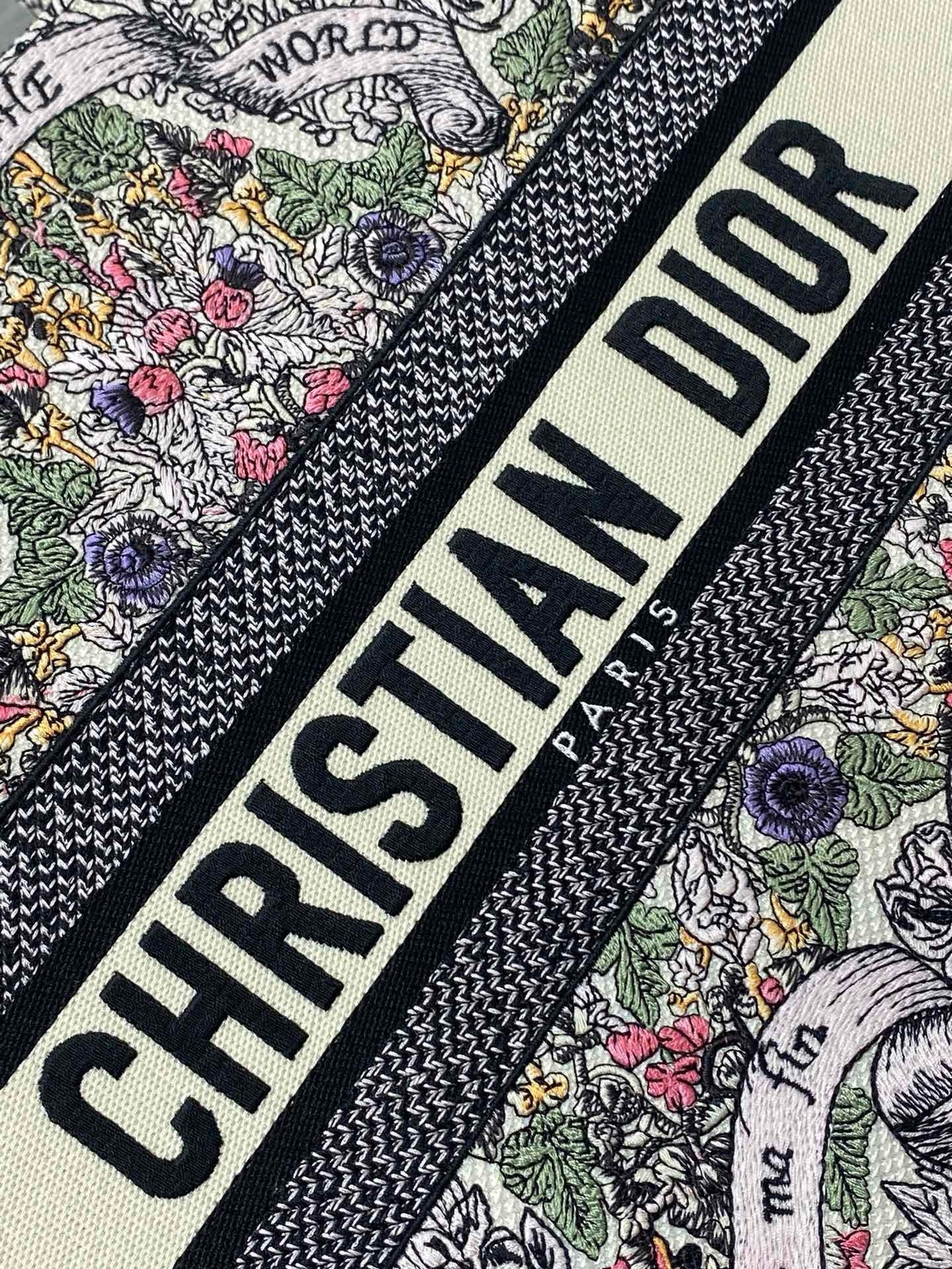 Introduced by Maria Grazia Chiuri, Creative Director of Christian Dior, the Dior Book Tote has become a staple of the Dior aesthetic. Designed to hold all the daily essentials, the latte style is fully embroidered with Pietro Ruffo's multicolor Dior Around the World motif, showcasing a star decorated with flowers in honor of Scottish heritage, the collection's hallmark theme, and an allegory of the senses with a Mary Stuart quote: 'En ma fin est mon commencement' (In my end is my beginning). Adorned with the Christian Dior Paris signature on the front, the medium tote is a prime example of Dior's savoir-faire and can be carried by hand or worn over the shoulder. The bag can be coordinated with the season's other Dior Around the World creations.