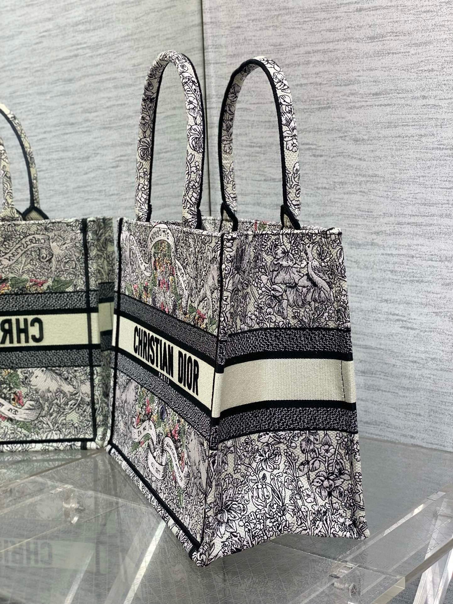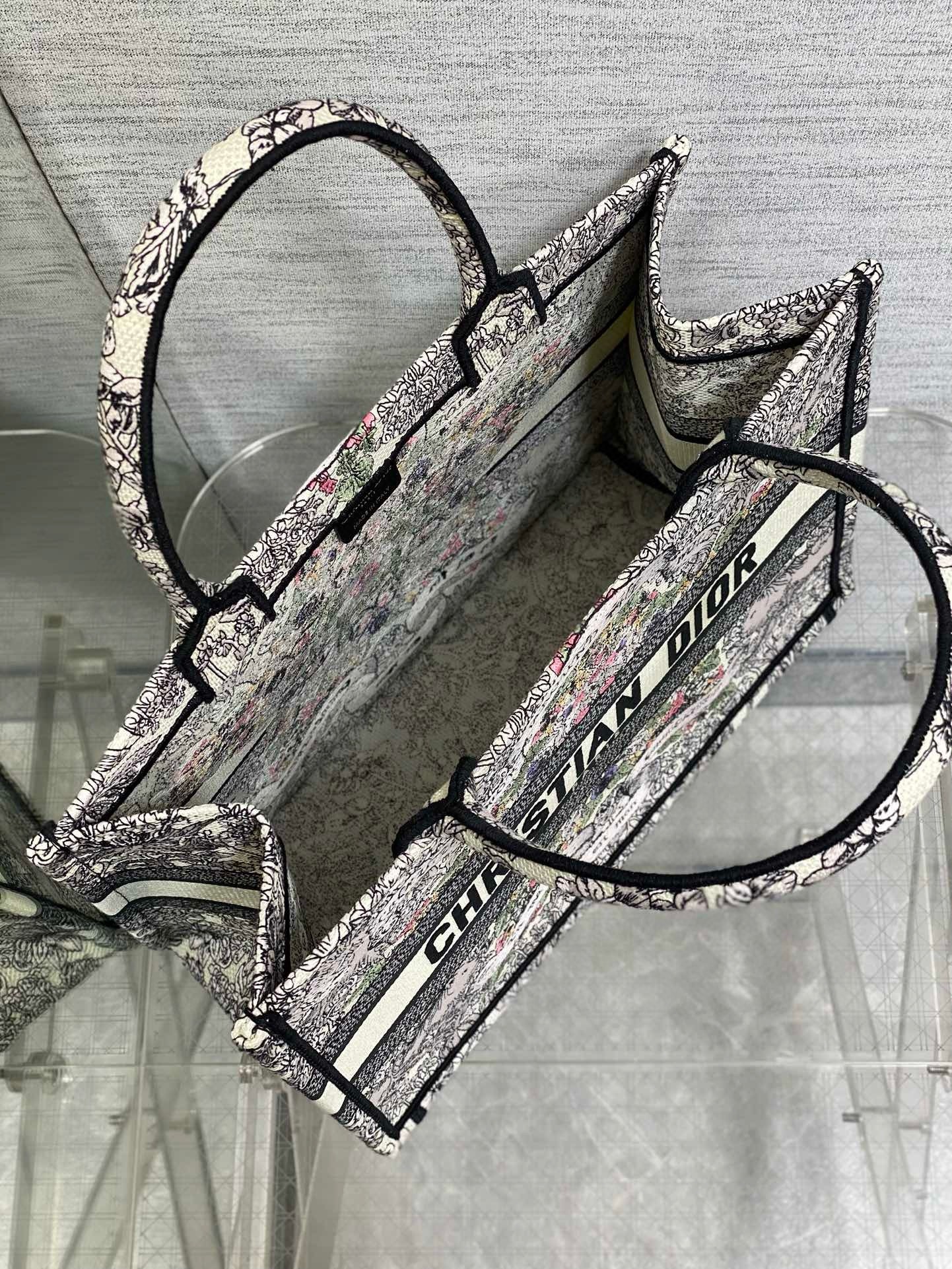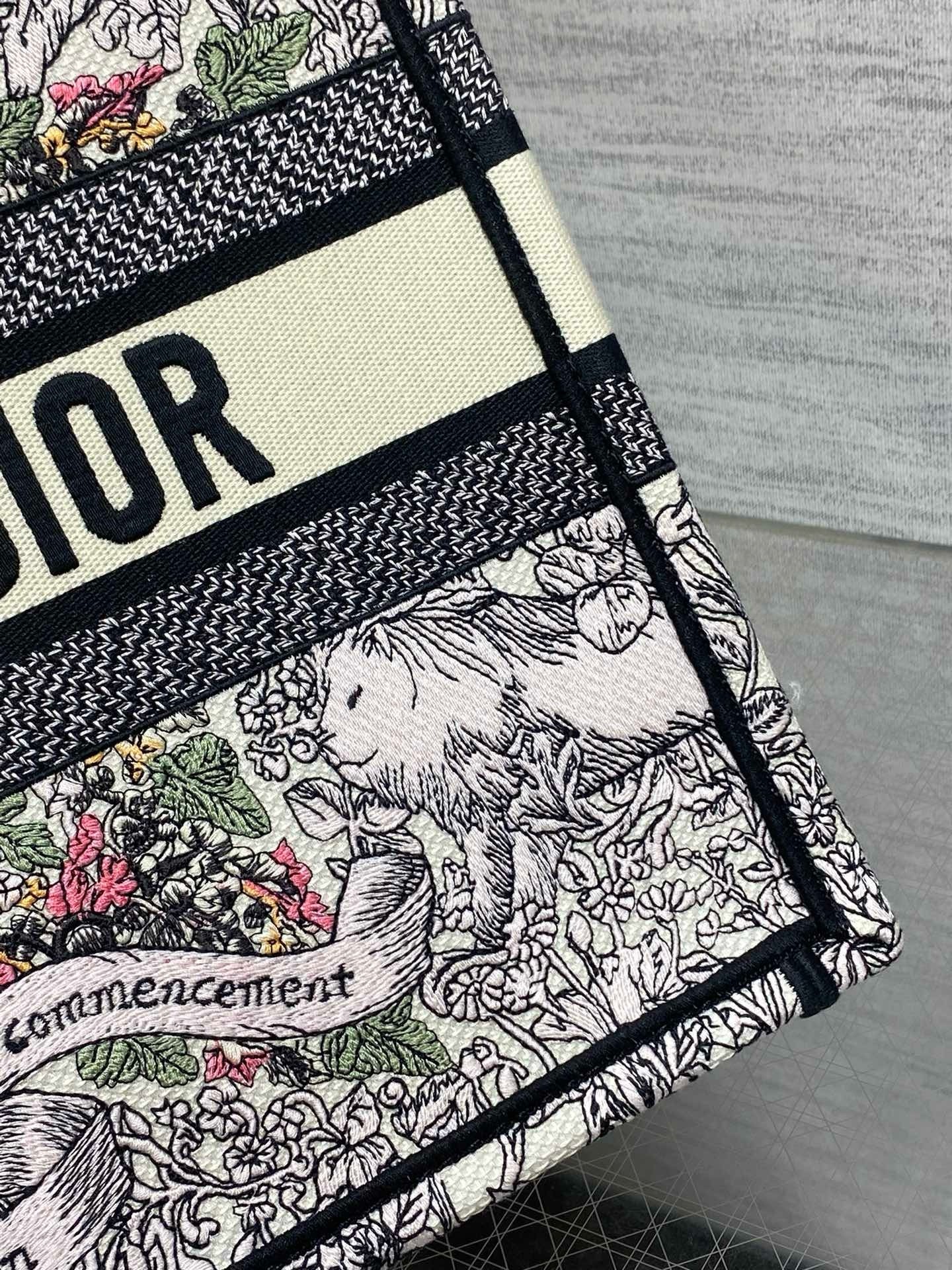 Introduced by Maria Grazia Chiuri, Creative Director of Christian Dior, the Dior Book Tote has become a staple of the Dior aesthetic. Designed to hold all the daily essentials, the latte style is fully embroidered with Pietro Ruffo's multicolor Dior Around the World motif, showcasing a star decorated with flowers in honor of Scottish heritage, the collection's hallmark theme, and an allegory of the senses with a Mary Stuart quote: 'En ma fin est mon commencement' (In my end is my beginning). Adorned with the Christian Dior Paris signature on the front, the medium tote is a prime example of Dior's savoir-faire and can be carried by hand or worn over the shoulder. The bag can be coordinated with the season's other Dior Around the World creations.