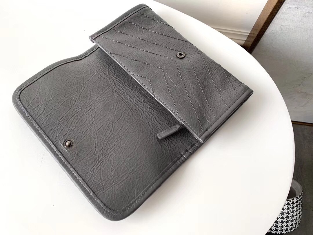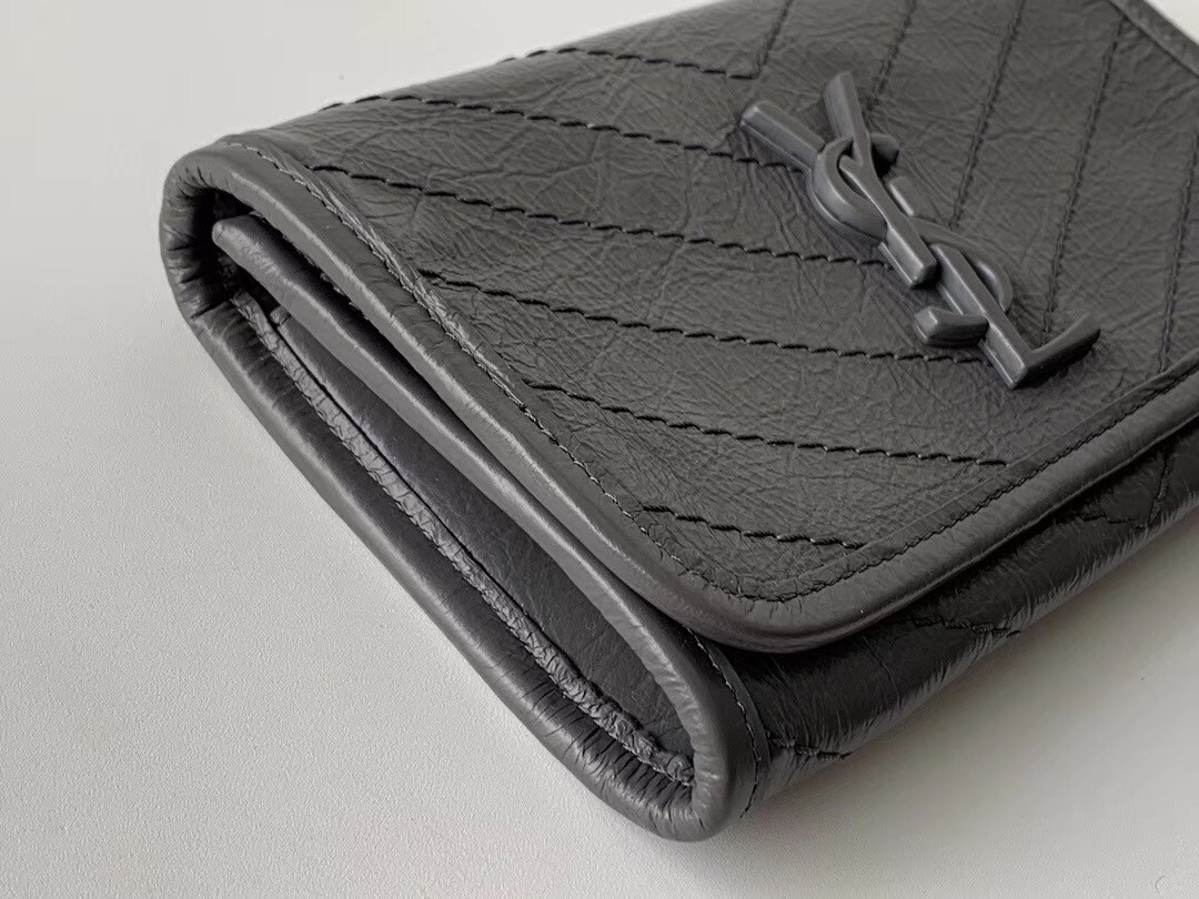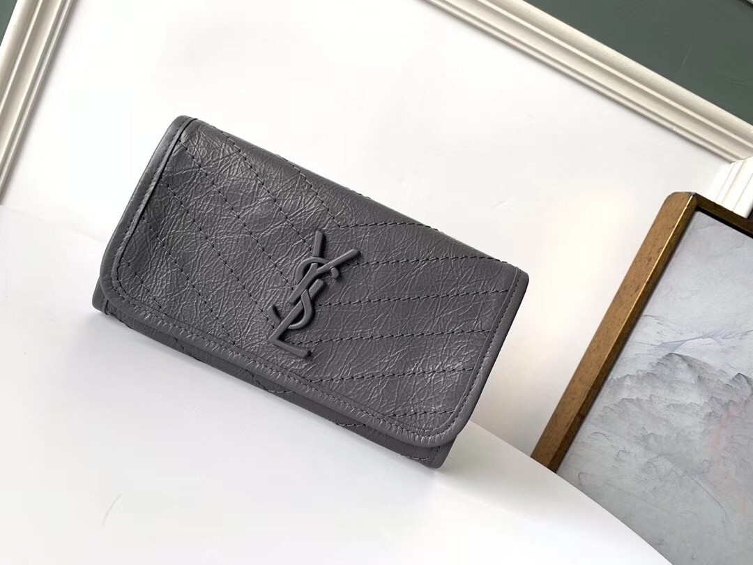 Inspired by the iconic Niki handbag, the Saint Laurent's Niki large wallet in supple glossed-leather that's crinkled to look somewhat vintage combines a functional design with fashion appeal. It's embroidered with chevrons and decorated with iconic 'YSL' hardware. Sensorial yet functional, it is still large enough to fit all your daily essentials.