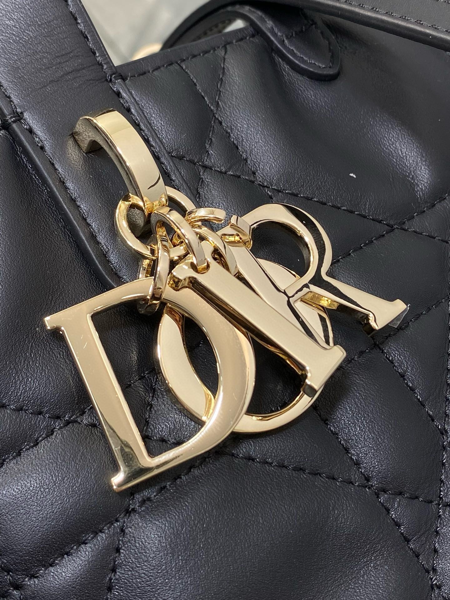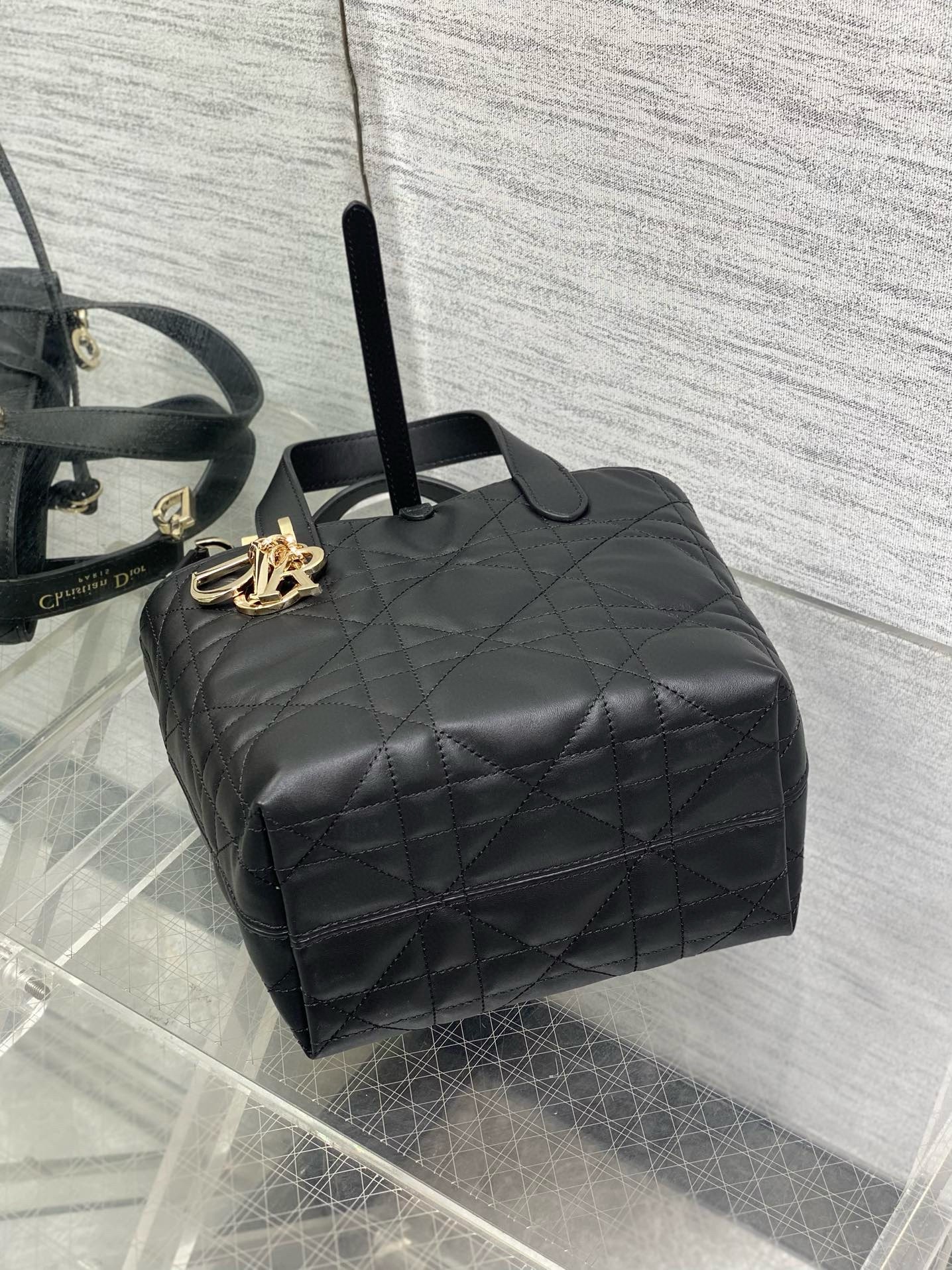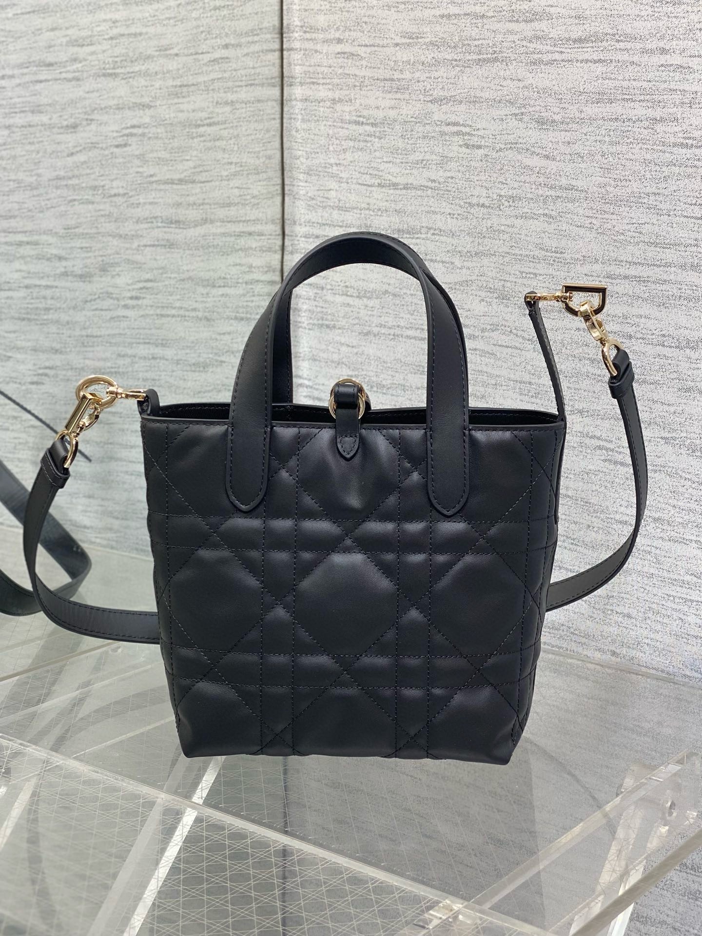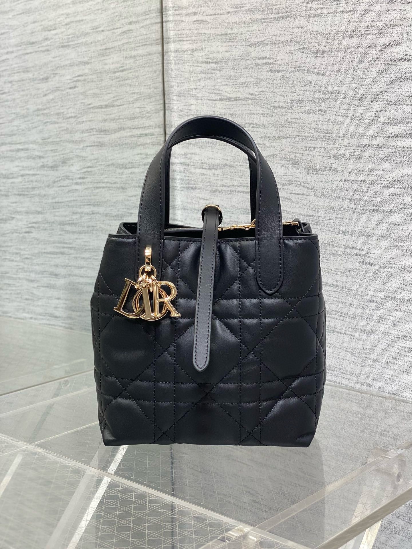 The Dior Toujours vertical tote bag is distinguished by a modern and practical design. Crafted in calfskin with Macrocannage topstitching, it has a spacious interior compartment to accommodate all the essentials. Its thin leather strap closure keeps items secure, while the D of the CD Lock clasp twists to adjust the sides and enhance the bag's silhouette. The leather top handles are completed by a removable leather strap, allowing the small bag to be carried by hand, worn over the shoulder or crossbody.