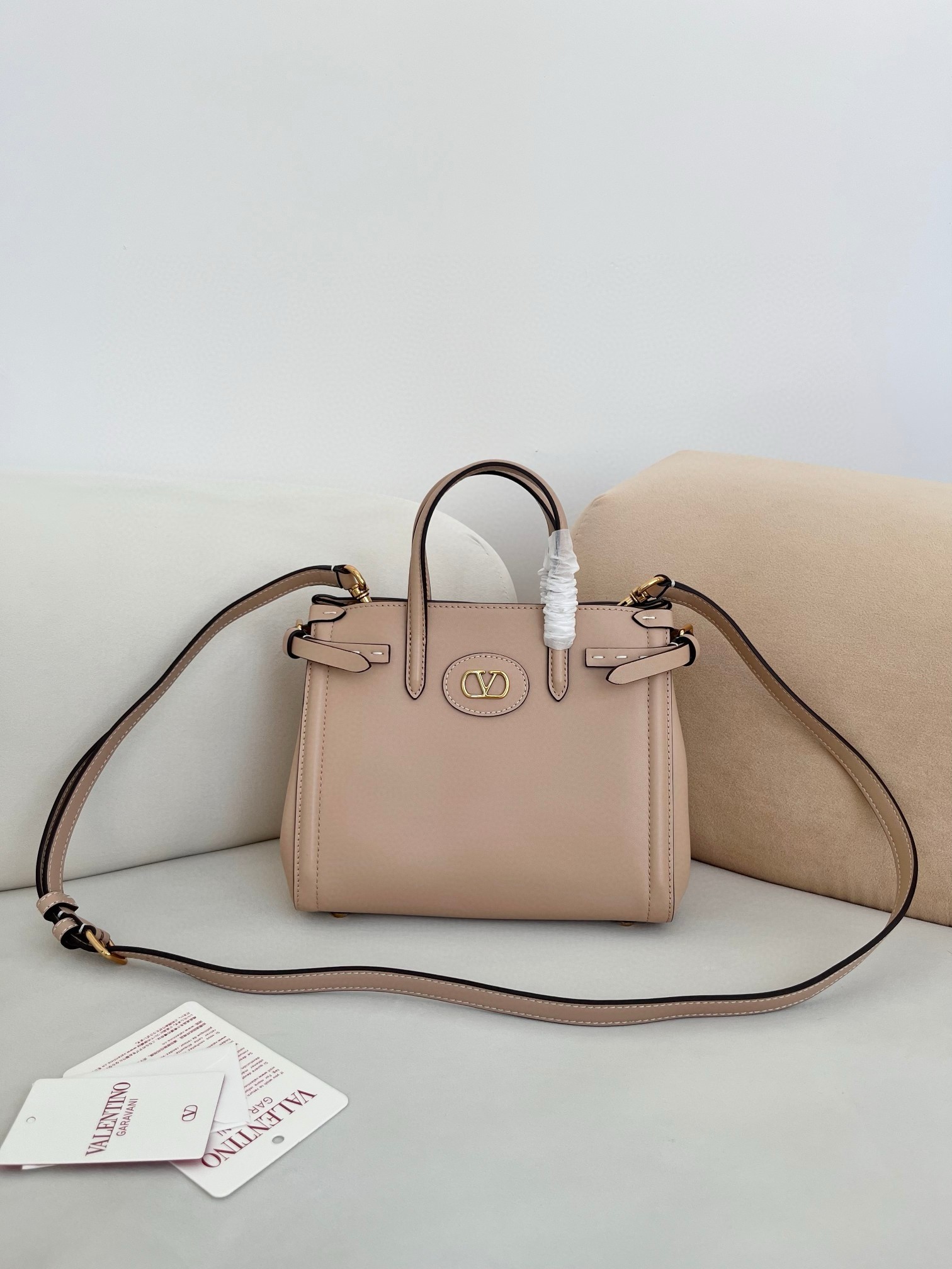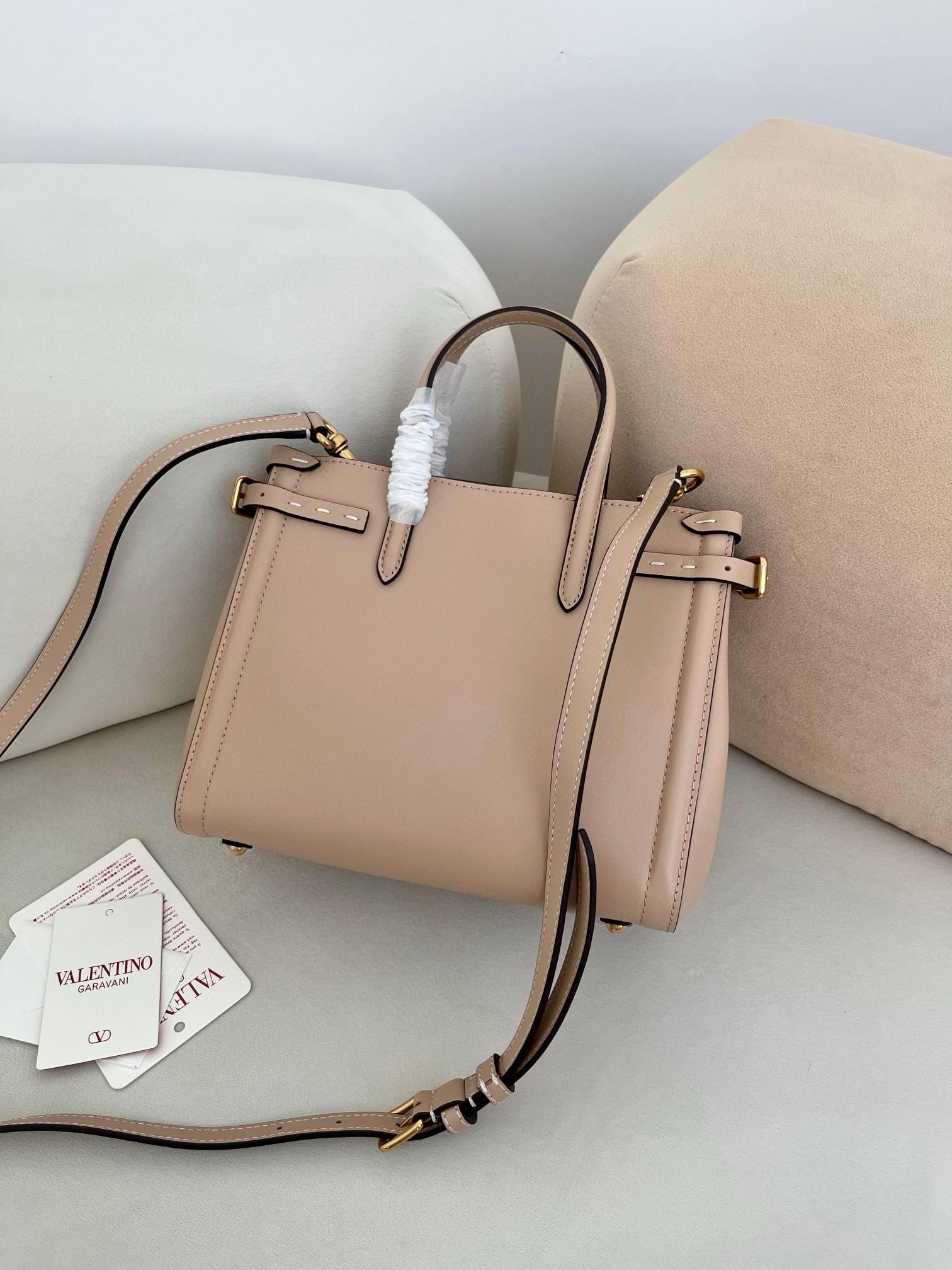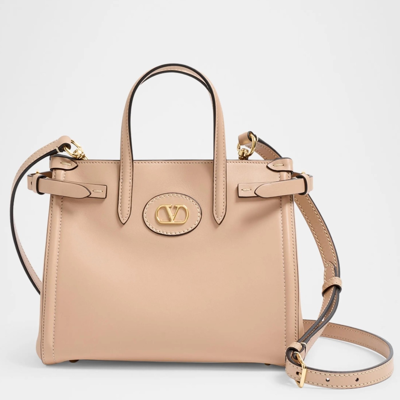 Valentino Garavani's Antibes tote is one you can count on to remain a versatile, timeless staple. Crafted from supple leather, this small iteration has slim buckled tabs that adjust the shape and features gold-tone hardware, including the 'VLogo'. The suede-lined interior has enough space for your phone, wallet and keys.