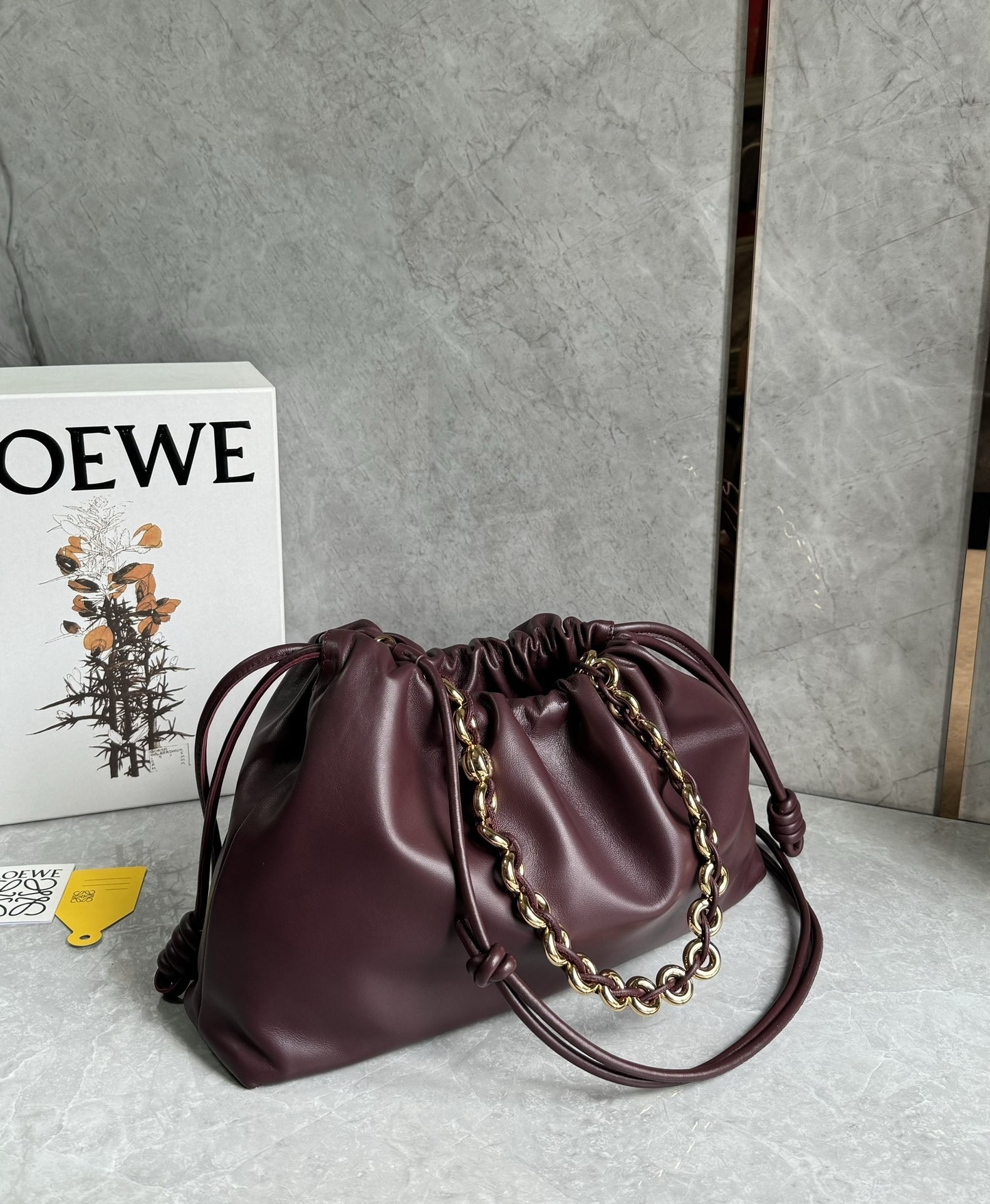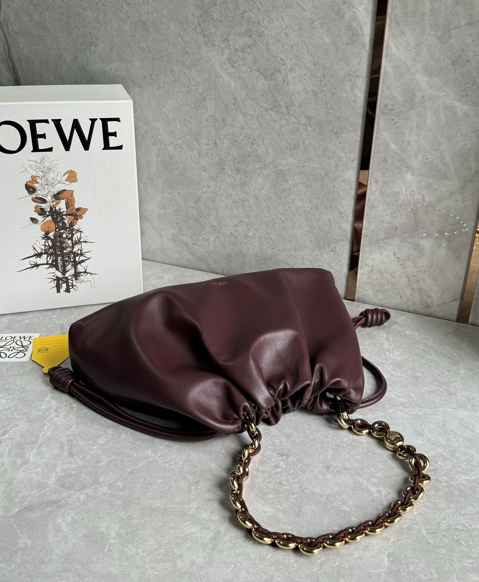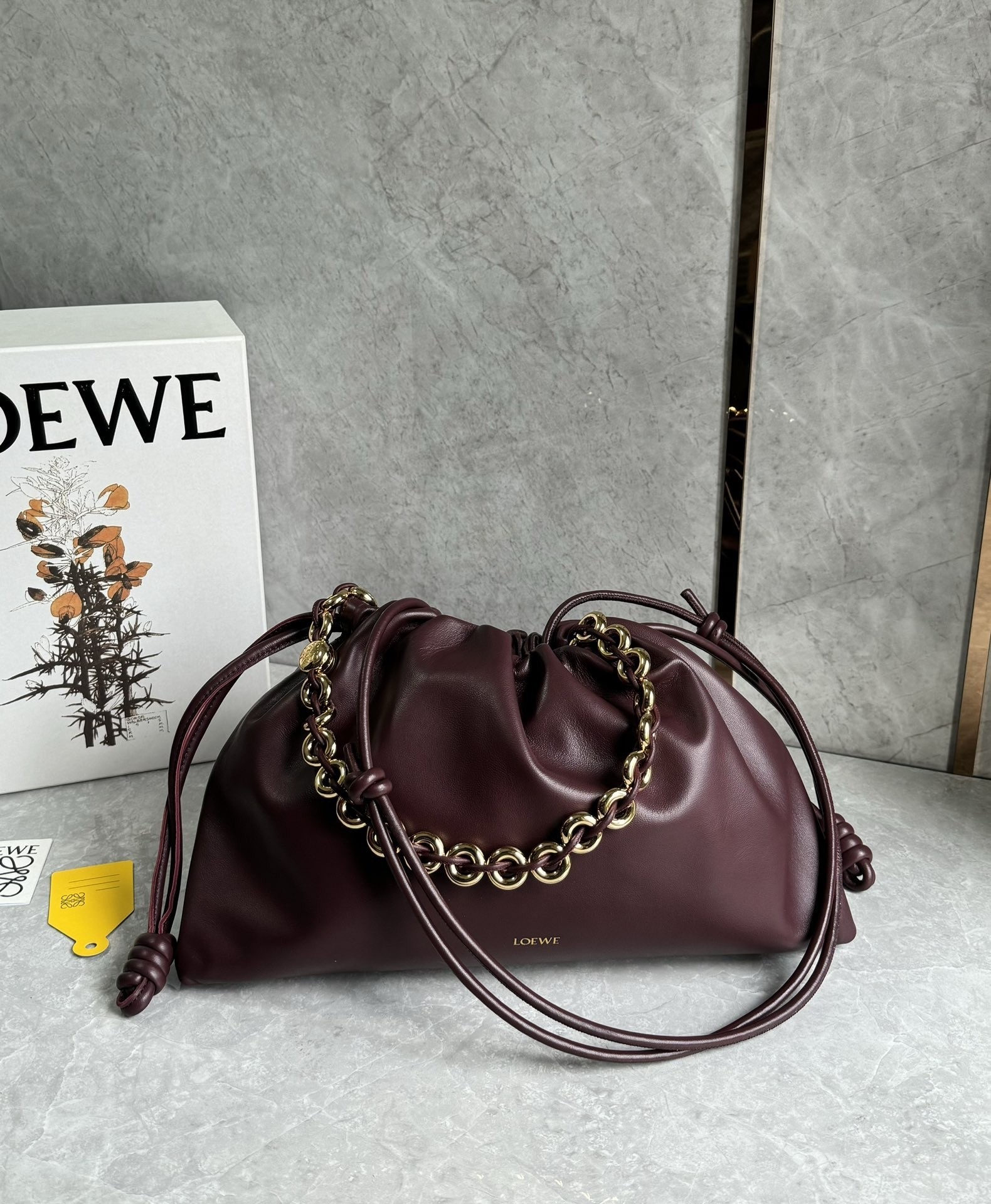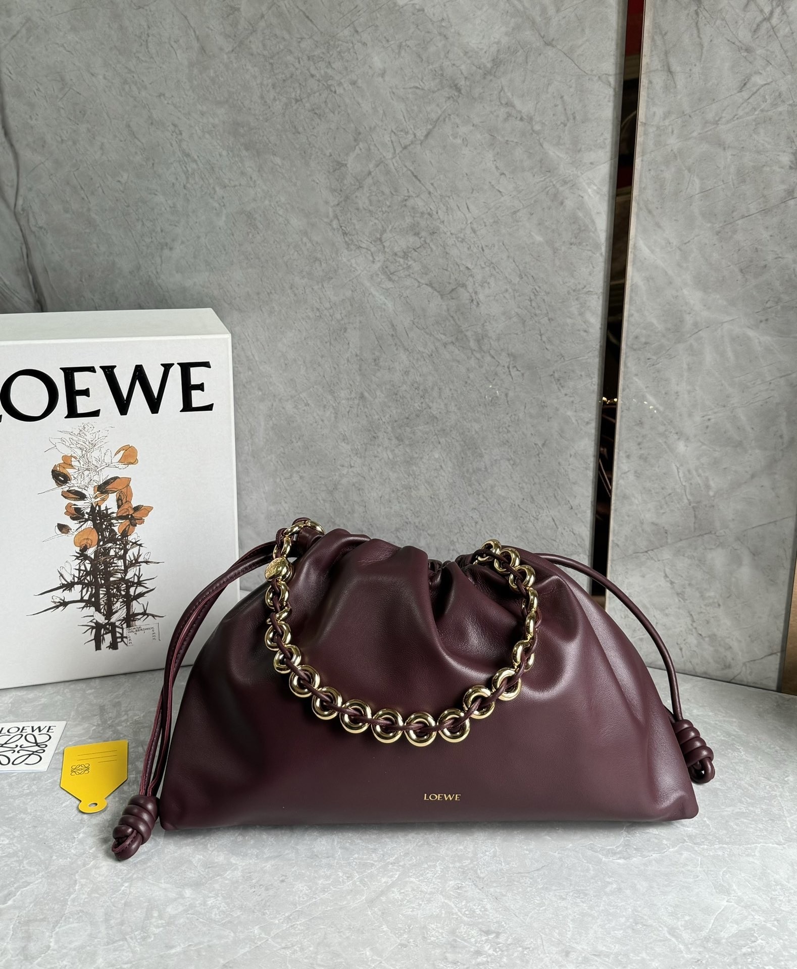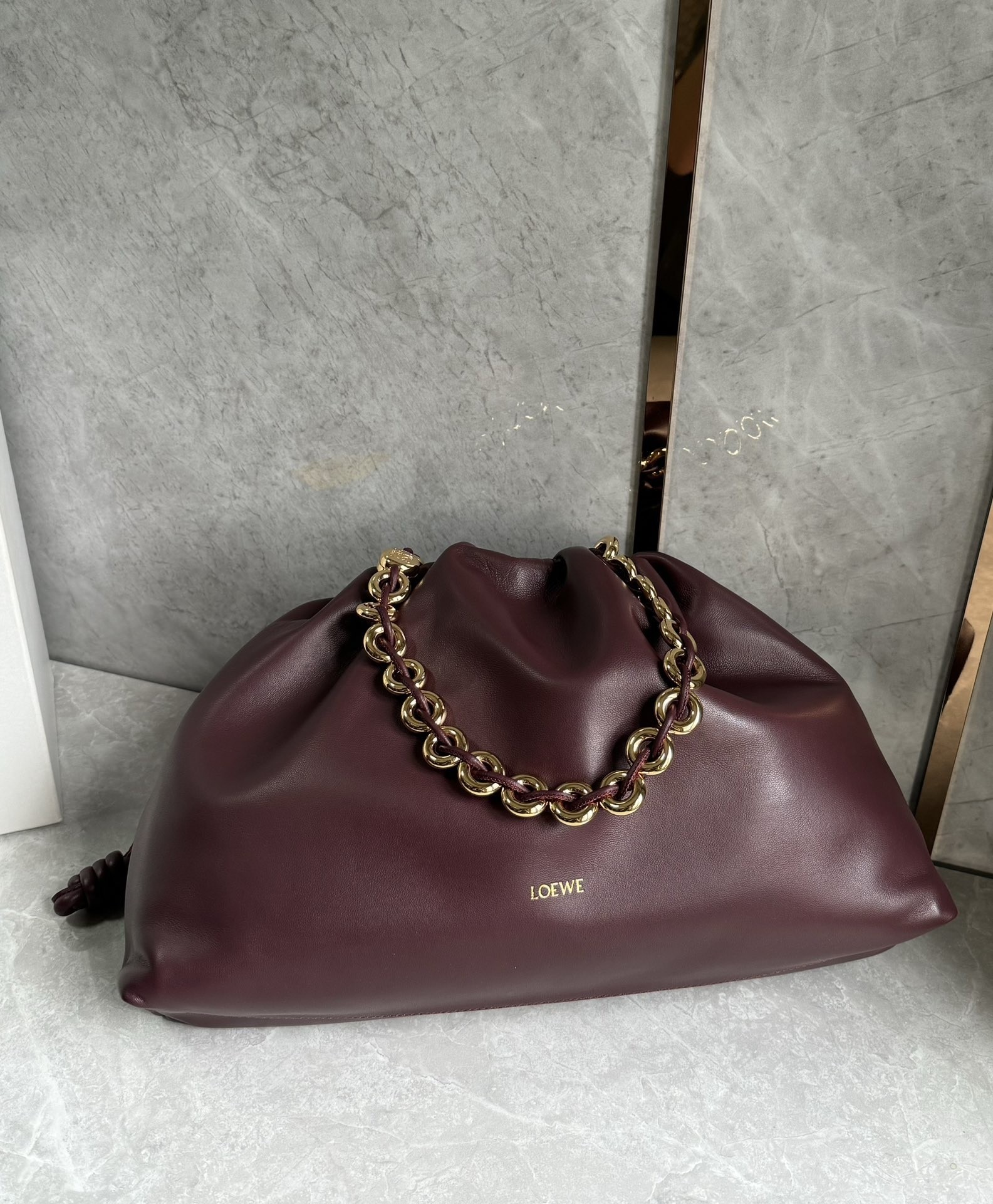Introducing the exquisite Loewe large Flamenco purse, a masterpiece of design and craftsmanship. This lightweight and sumptuously soft bag, crafted from nappa lambskin, boasts a distinctive ruched shape. It features historical knot drawstrings, alongside a striking, detachable donut chain adorned with an elegant Anagram Pebble. A secure magnetic closure ensures your essentials are safe, while the gold embossed LOEWE logo subtly declares its heritage.