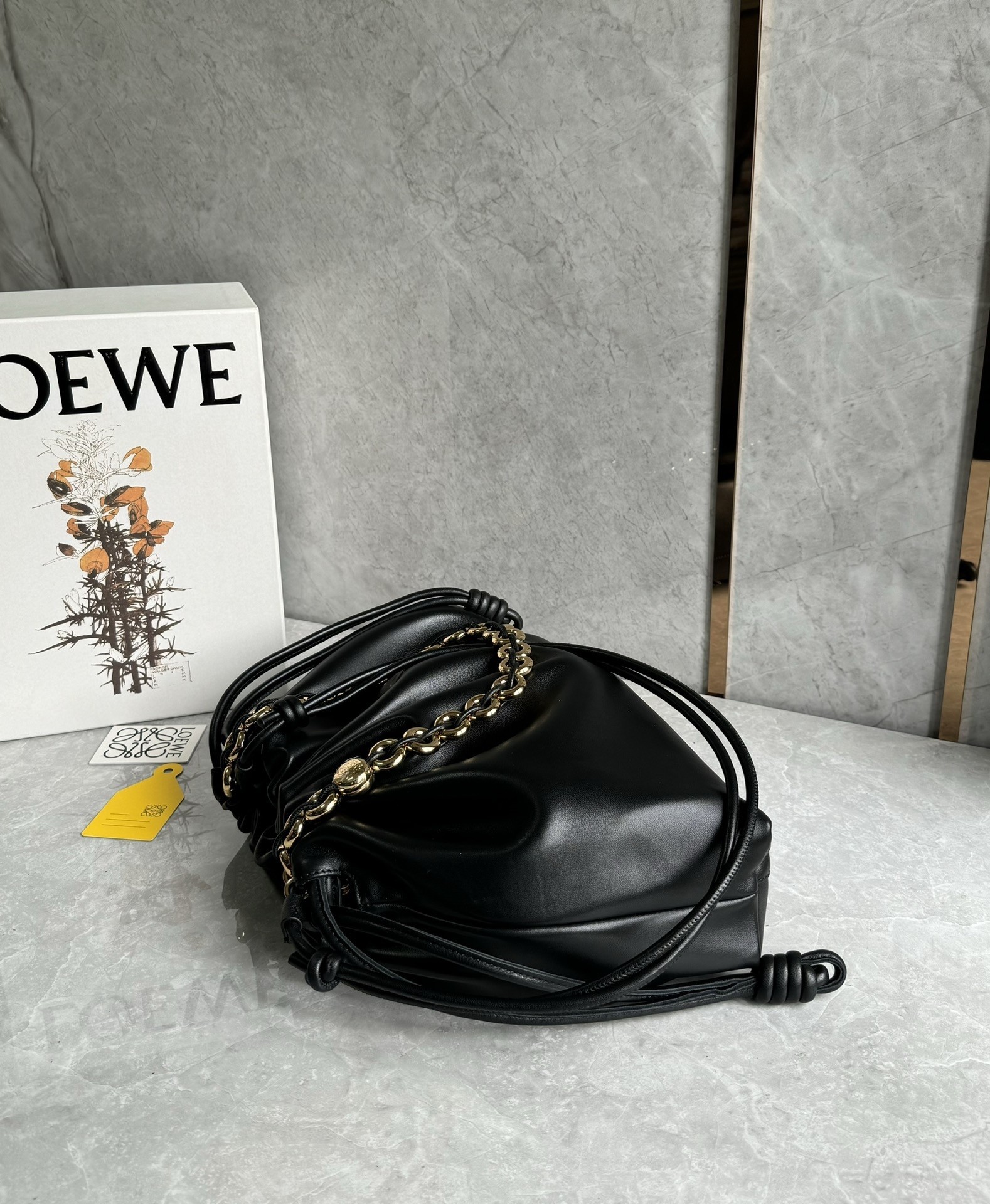 Introducing the exquisite Loewe large Flamenco purse, a masterpiece of design and craftsmanship. This lightweight and sumptuously soft bag, crafted from nappa lambskin, boasts a distinctive ruched shape. It features historical knot drawstrings, alongside a striking, detachable donut chain adorned with an elegant Anagram Pebble. A secure magnetic closure ensures your essentials are safe, while the gold embossed LOEWE logo subtly declares its heritage.