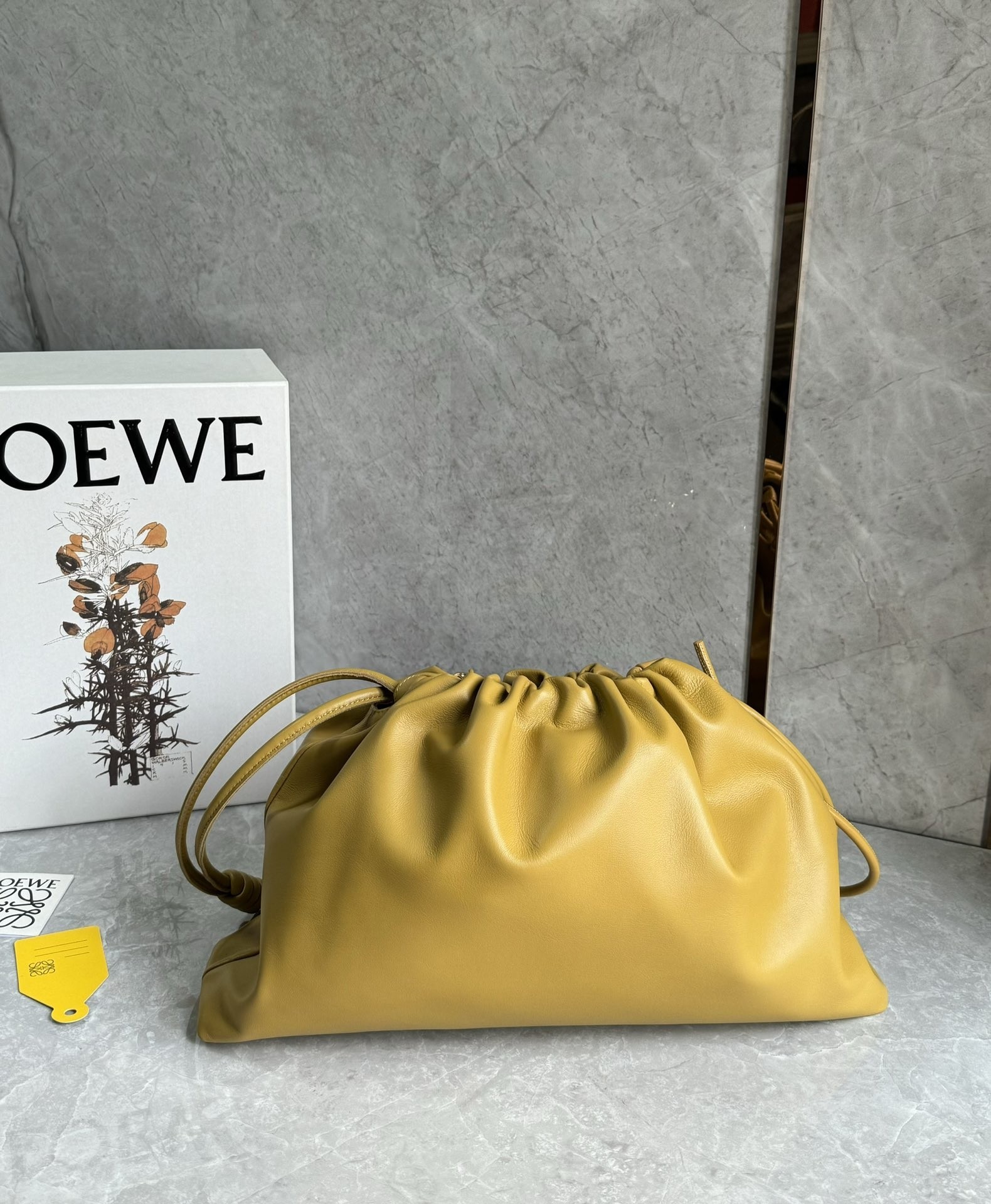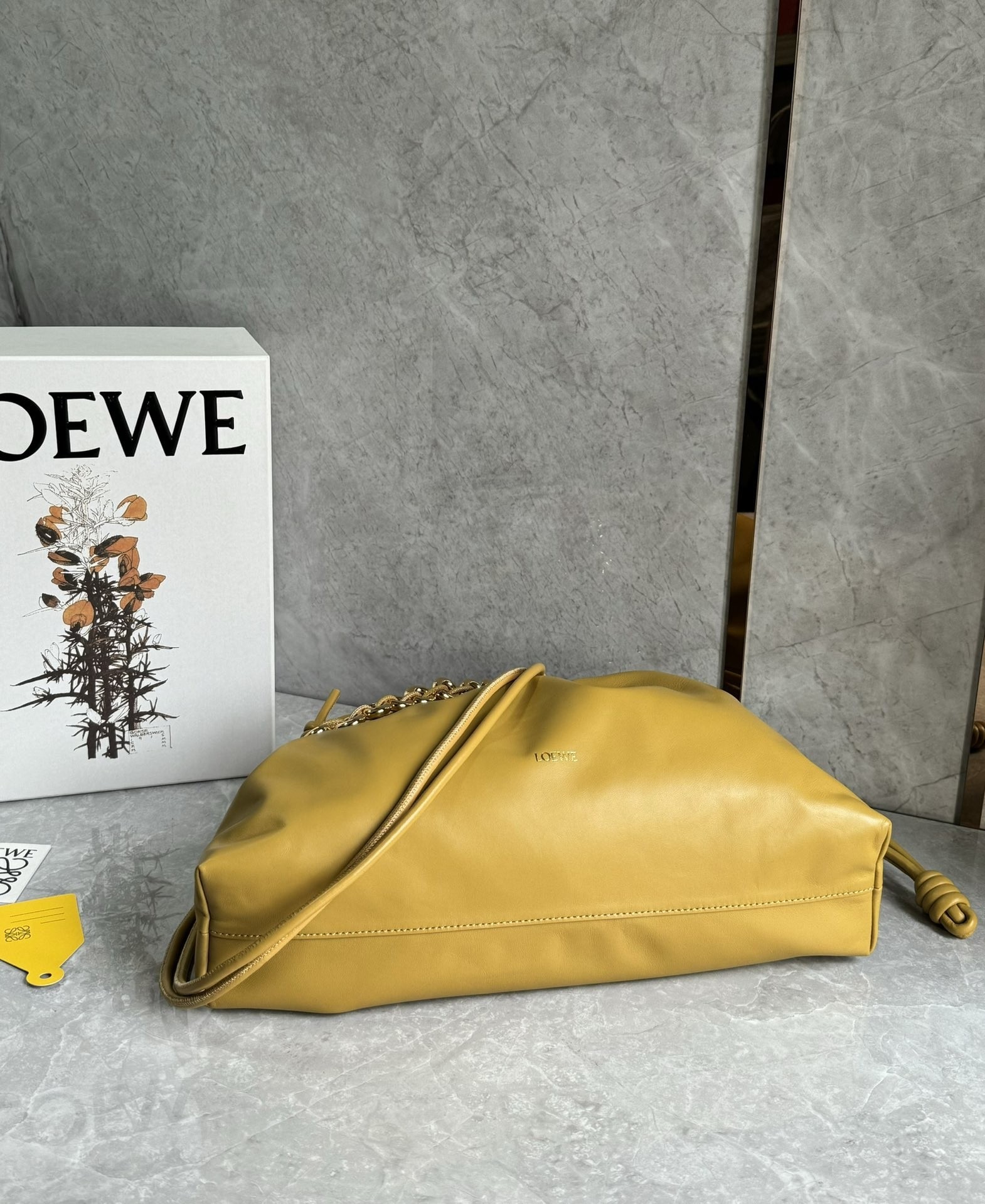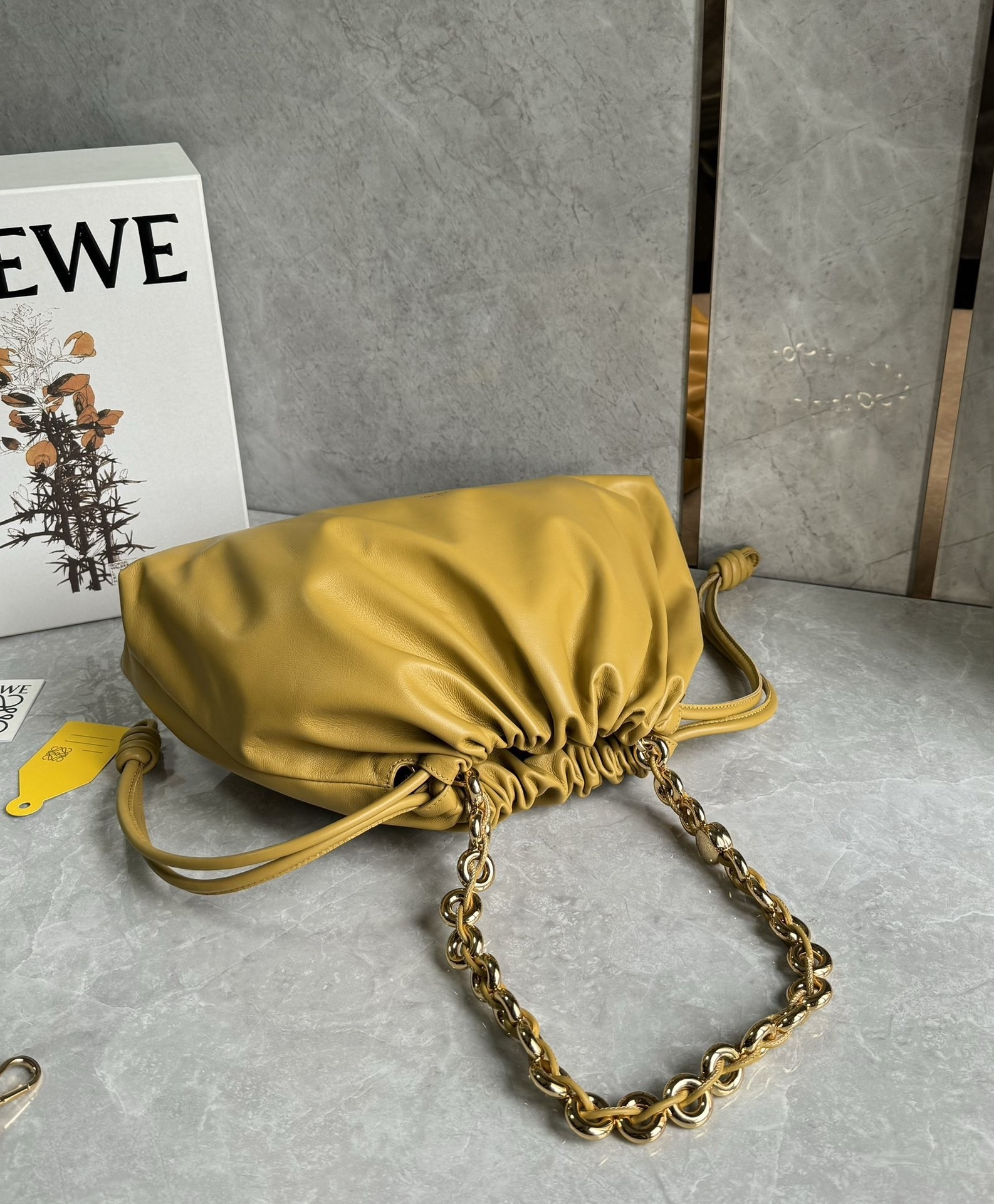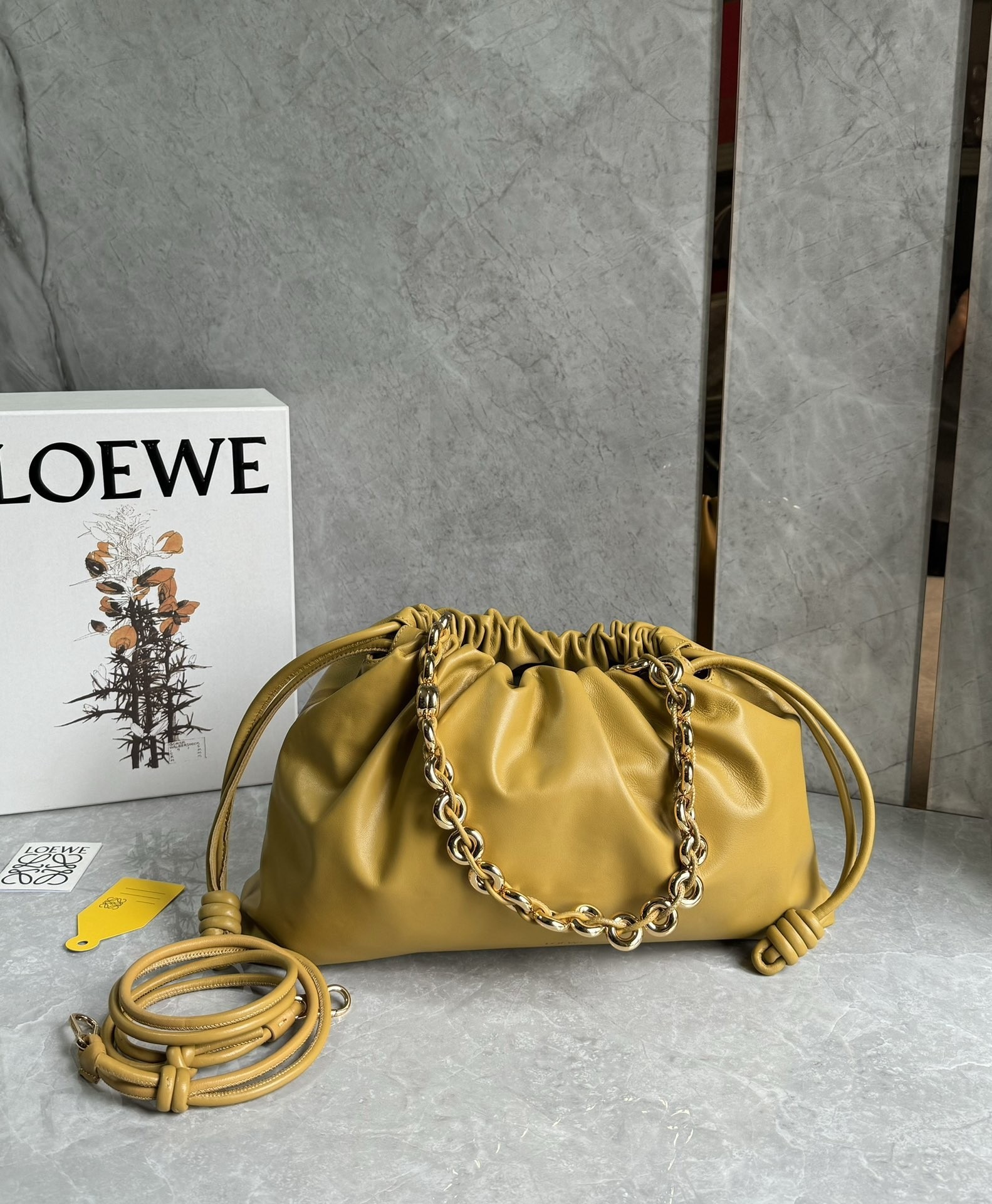 Introducing the exquisite Loewe large Flamenco purse, a masterpiece of design and craftsmanship. This lightweight and sumptuously soft bag, crafted from nappa lambskin, boasts a distinctive ruched shape. It features historical knot drawstrings, alongside a striking, detachable donut chain adorned with an elegant Anagram Pebble. A secure magnetic closure ensures your essentials are safe, while the gold embossed LOEWE logo subtly declares its heritage.