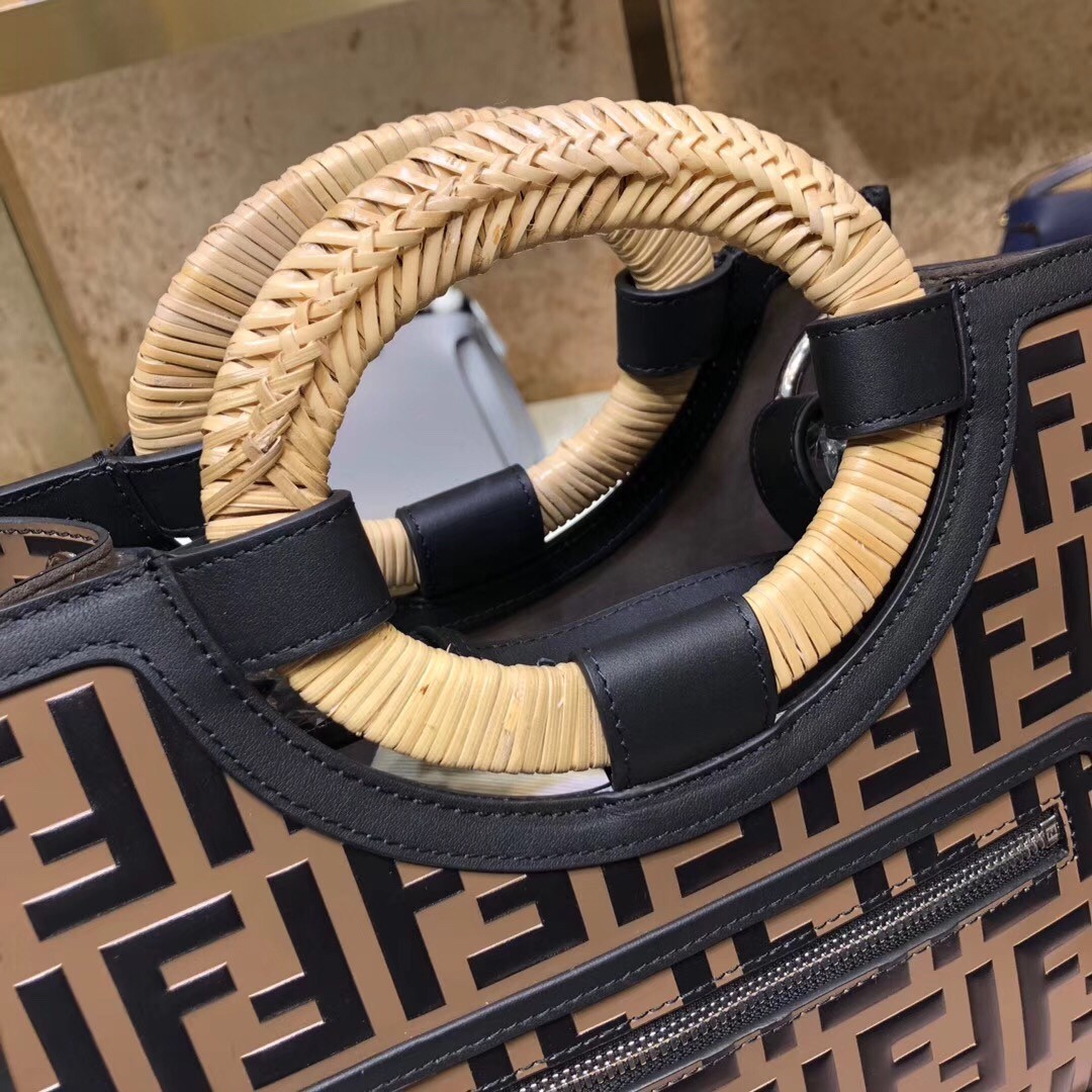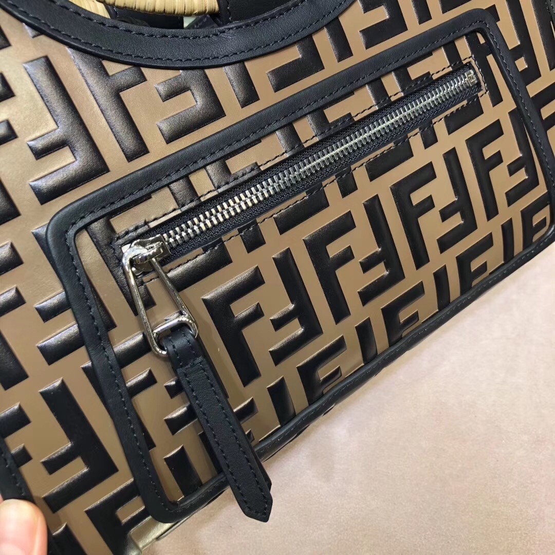 This season the sleek line of Fendi bags are highlighted by the iconic Fendi logo. Steal the spotlight by adding one of these designs that work for every occasion to your wardrobe. This brown calf leather and straw Runaway shopper bag from Fendi features a front zip pocket, a detachable shoulder strap, a main internal compartment, contrasting light brown rigid oval top handles and an embossed FF logo pattern all over.