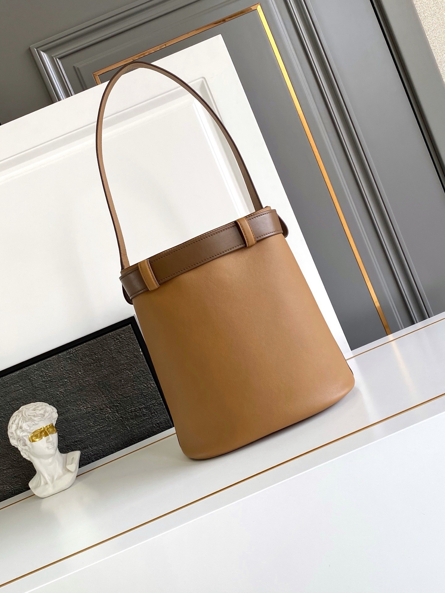 Prada Buckle Bucket Bag is designed to be functional and practical. The Buckle is not only made to be a functional closure but also as a central decoration motif. Crafted from premium leather, this elegant yet functional bag features a leather handle with an adjustable drop for comfortable shoulder carrying. The lettering logo stamped on the front maintains Prada’s signature minimalist aesthetic.
