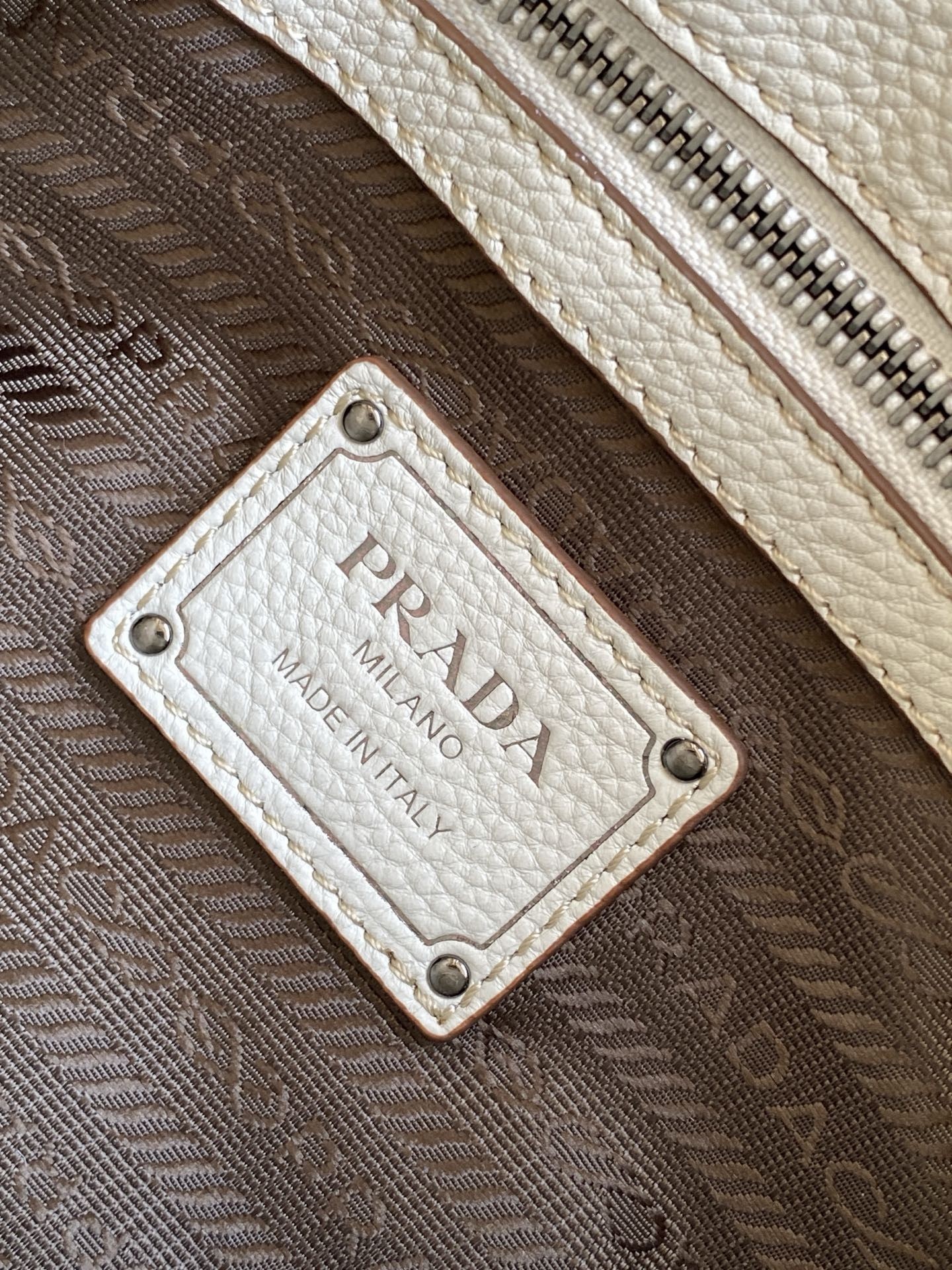 In harmony between past and present, this bag marks a return to the roots of the Prada DNA with a design that recalls the travel theme. The compact, versatile silhouette made of leather with a rich texture and irregular grain is completed by a detachable shoulder strap for wearing the accessory different ways. Reinforced corners, inspired by travel bags, express the constant dialogue with traditional artisan crafting and the archives.