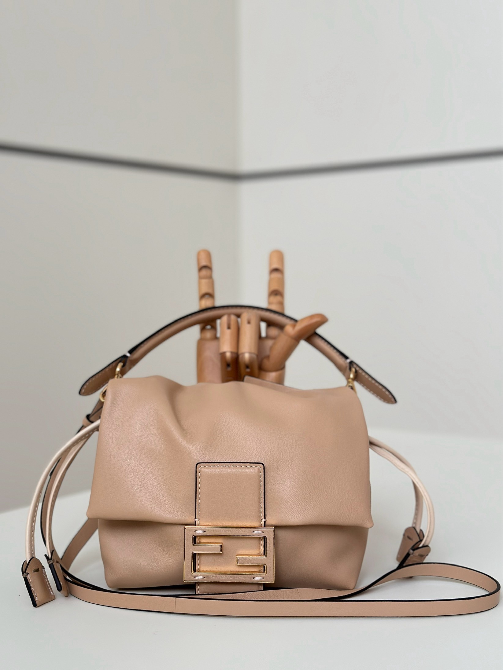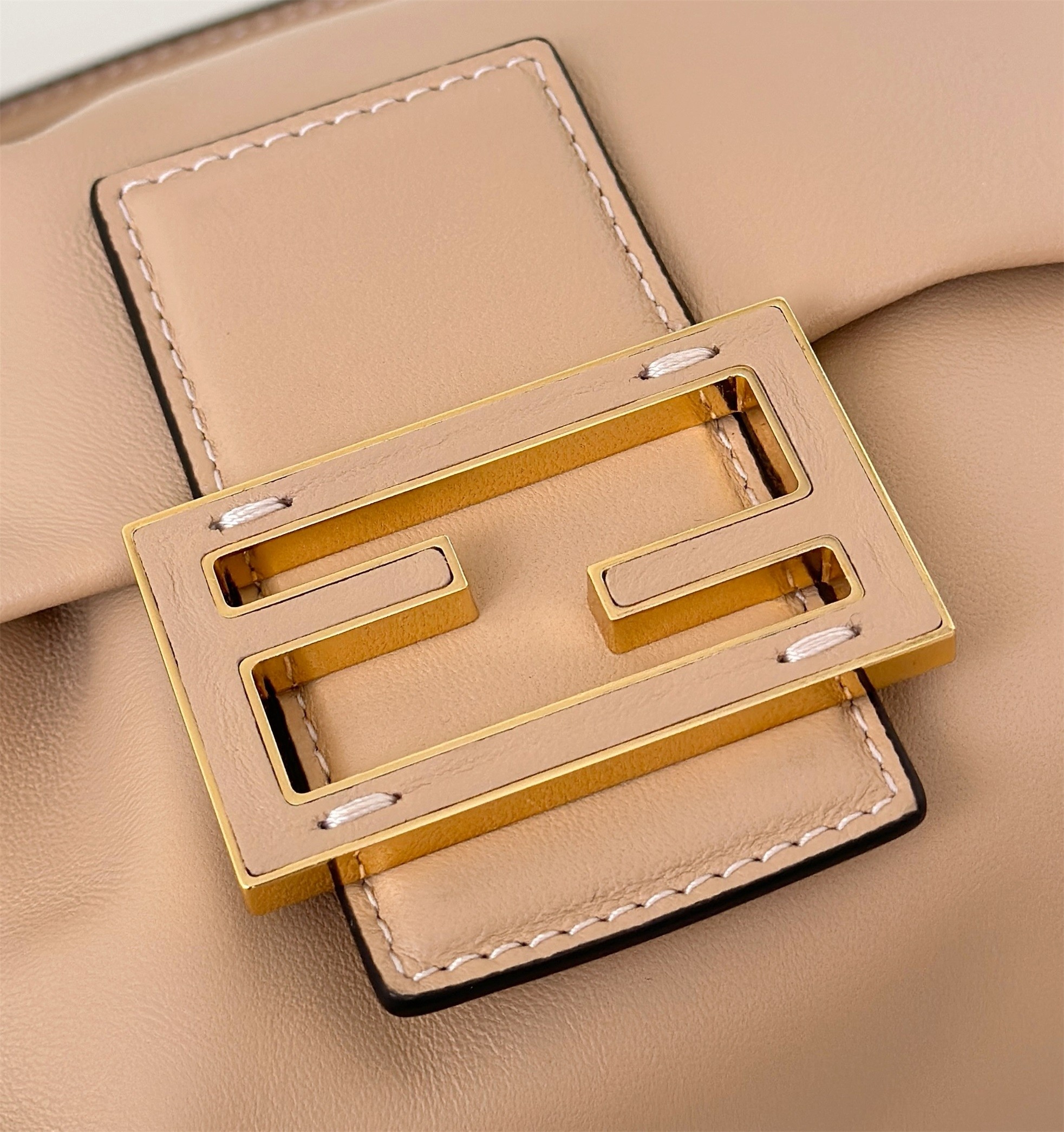 Iconic small Mamma Baguette bag, created in the late 1990s as a larger version of the iconic Baguette, hence the name Mamma Baguette. Updated for the Spring/Summer 2025 fashion show with a soft, deconstructed look while retaining the original elements of the bag. Made of soft nappa leather embellished with a metal FF clasp with tone-on-tone leather insert. Large suede-lined internal compartment with drawstring closure featuring cream-colored leather ties and customized details.