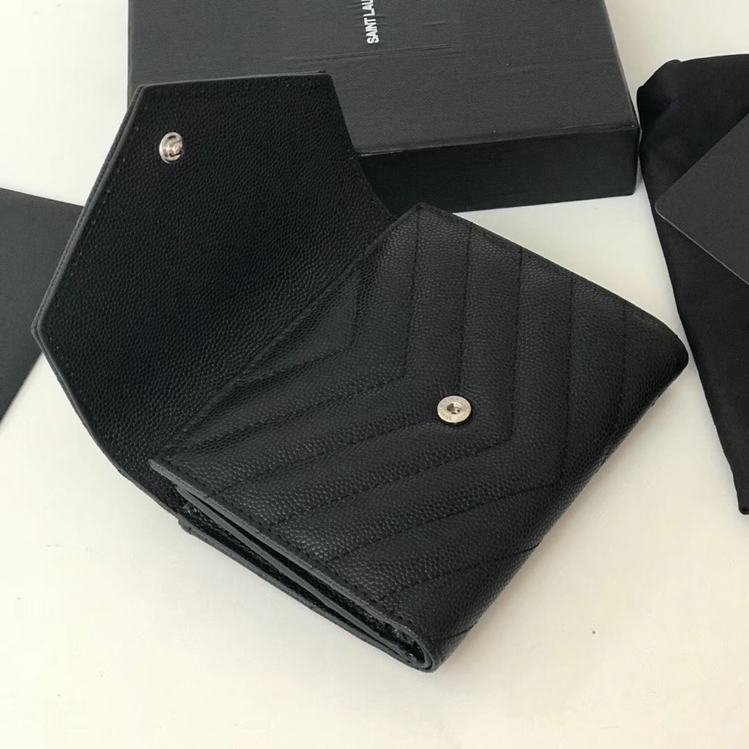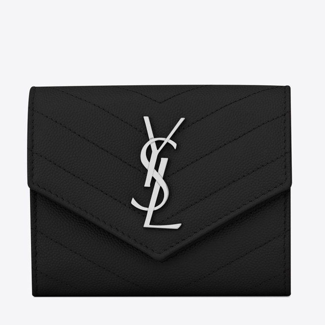 The Compact Tri Fold wallet looks chic in grain de poudre embossed leather, which is finished with interlaced YSL metal initials. Small enough to fit into even a tiny bag or clutch, yet with space for coins, notes and credit cards, this neat wallet is the ultimate mini companion.
