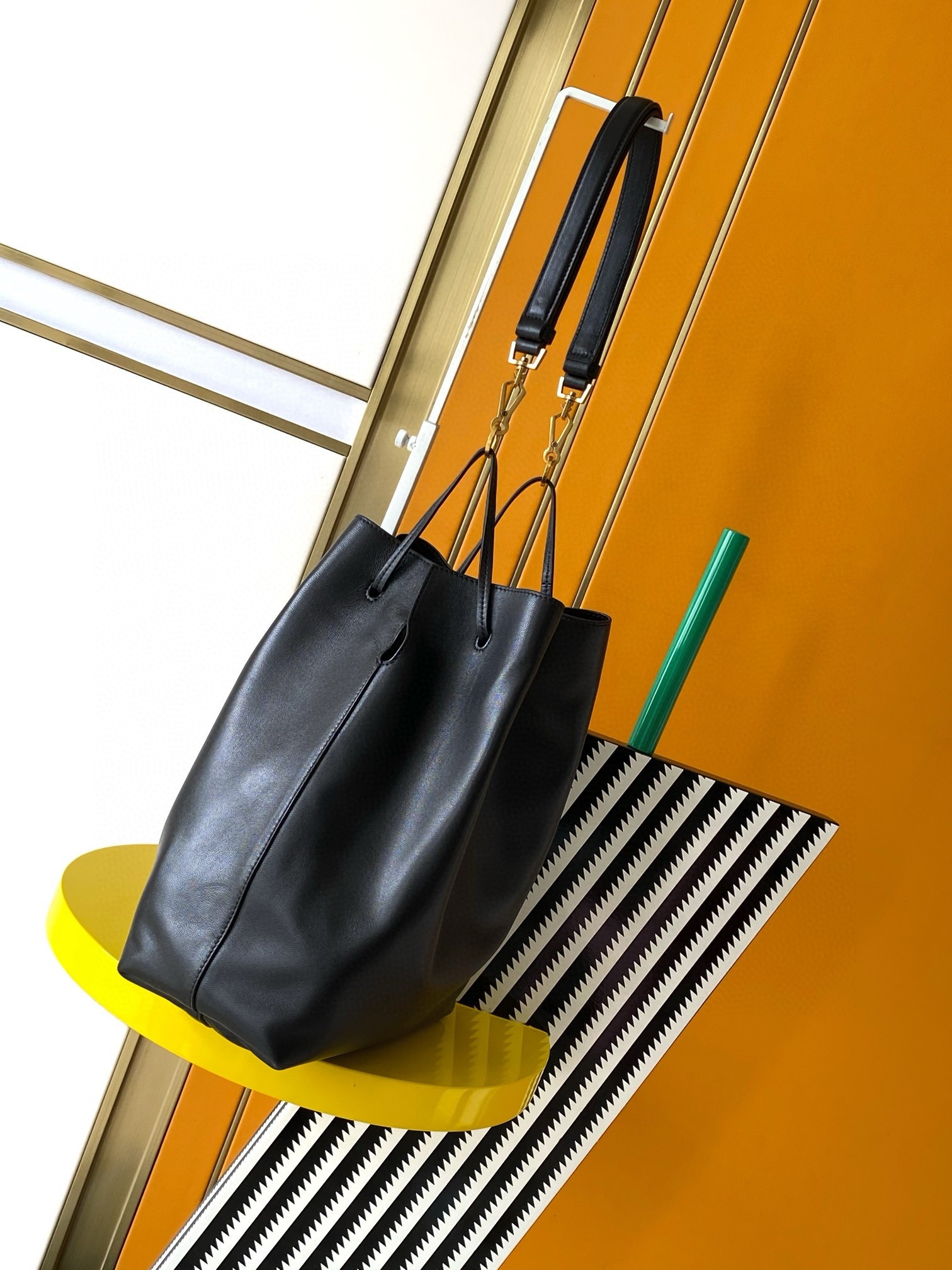 The Saint Laurent pouch version of the PARIS VII in supple nappa decorated with the signature CASSANDRE charm, lined in tonal suede. This bold, lightweight bag features an adjustable carabiner strap for shoulder carry.