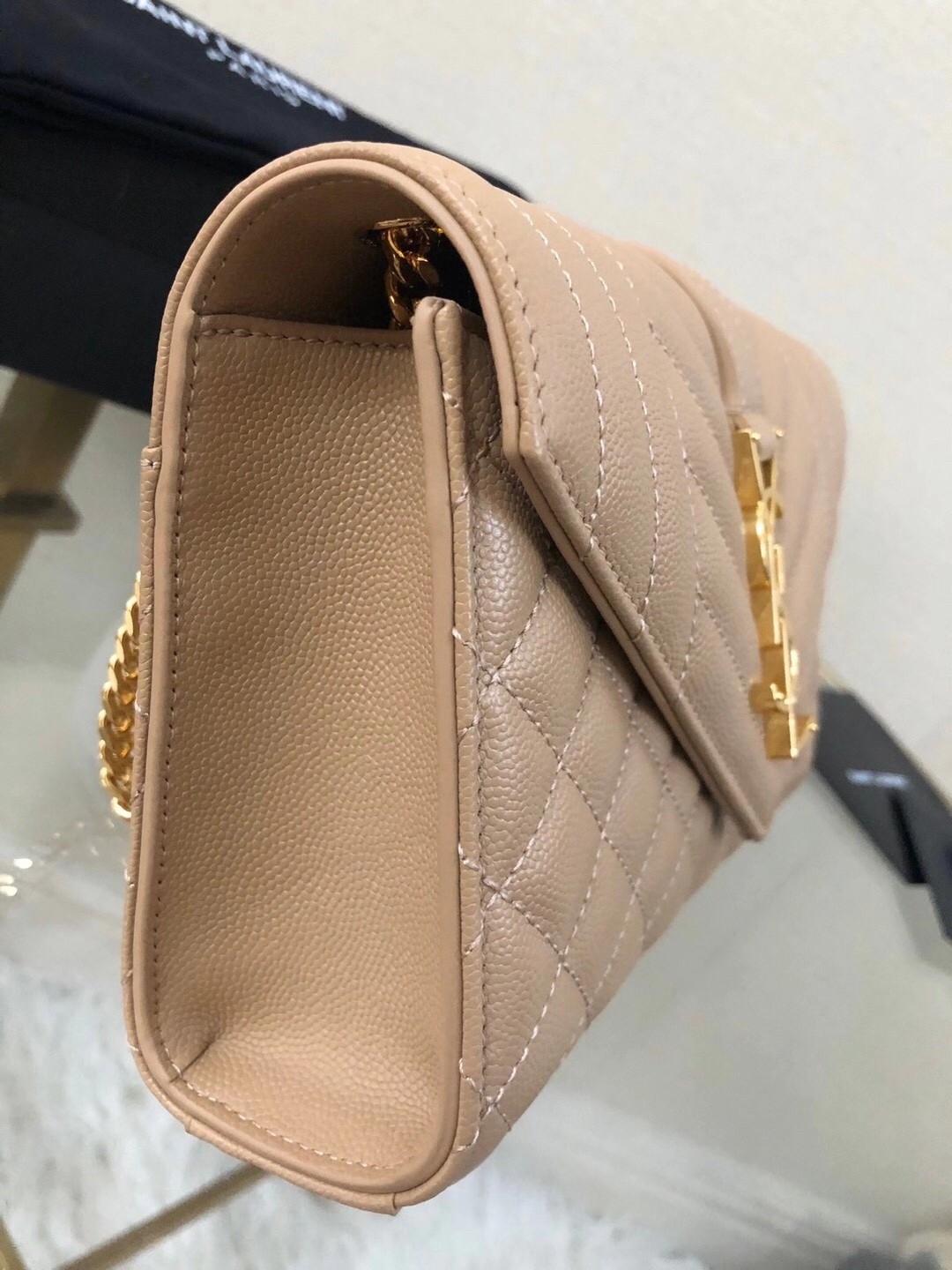 This small version of SAINT LAURENT's 'Envelope' bag is the perfect choice for evenings out. It's been expertly made from quilted grained leather and has polished gold hardware, including a chain strap and the iconic 'YSL' logo on the flap. The back has a convenient slip pocket for easy access to your cards and other essentials.